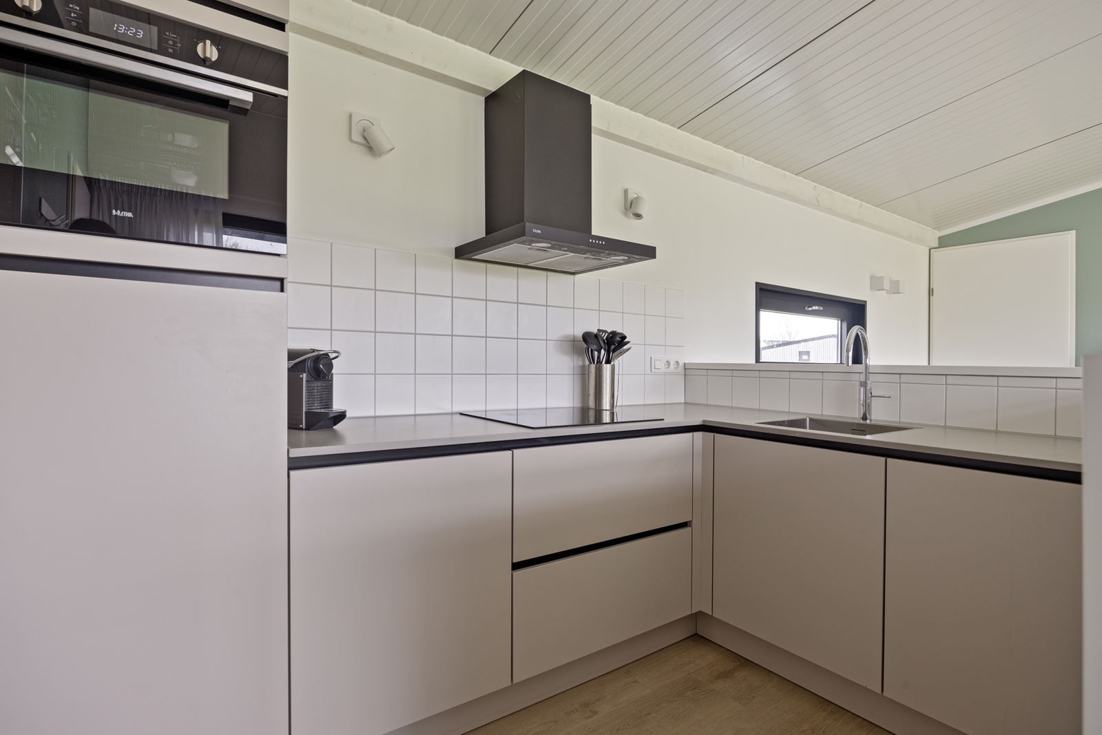 Die Küche ist in einer Ecke angeordnet. Die schönen glatten beigen Küchenschränke passen perfekt zur Atmosphäre des Hauses, schlicht und doch gemütlich. Die Küche ist natürlich mit einem Kühlschrank mit Gefrierfach, einem Geschirrspüler, einer Kombimikrowelle und einem Induktionskochfeld ausgestattet und die schwarze Dunstabzugshaube rundet das Bild ab.