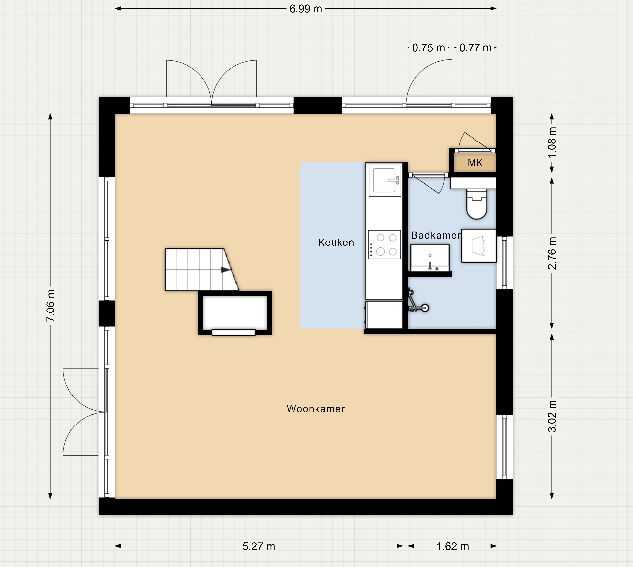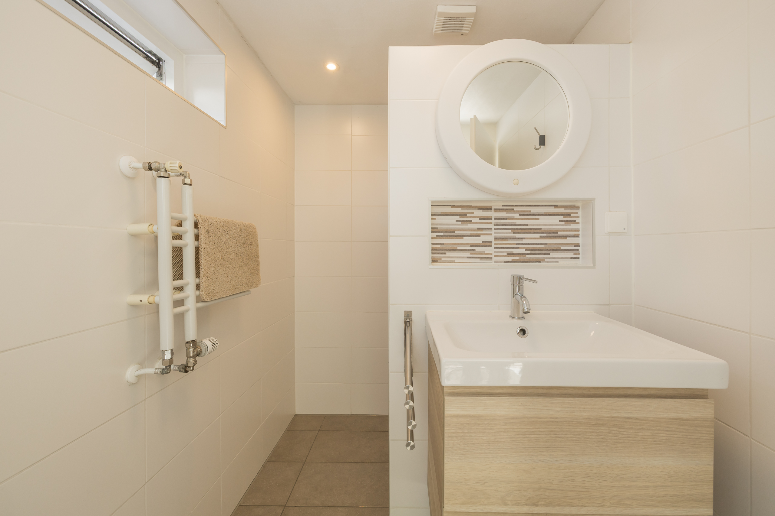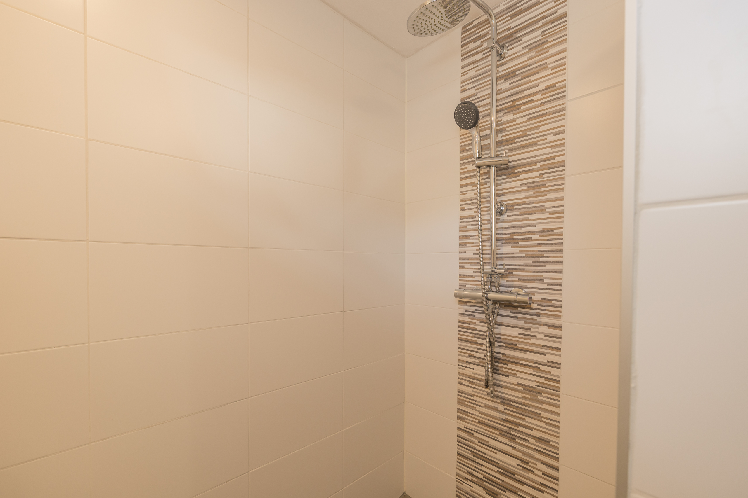 Eingang, Flur mit Zählerschrank und Zugang zum gefliesten Badezimmer mit Wandtoilette, Waschtischmöbel und begehbarer Dusche mit Regendusche. Die helle Küche hat Stimmungsbeleuchtung und Einbaugeräte: Induktionskochfeld, Dunstabzugshaube, Geschirrspüler, Kühlschrank, Kombimikrowelle und Waschmaschine. Das Wohnzimmer ist hell durch große Fenster und hat einen Bioethanol-Kamin und Laminatboden.