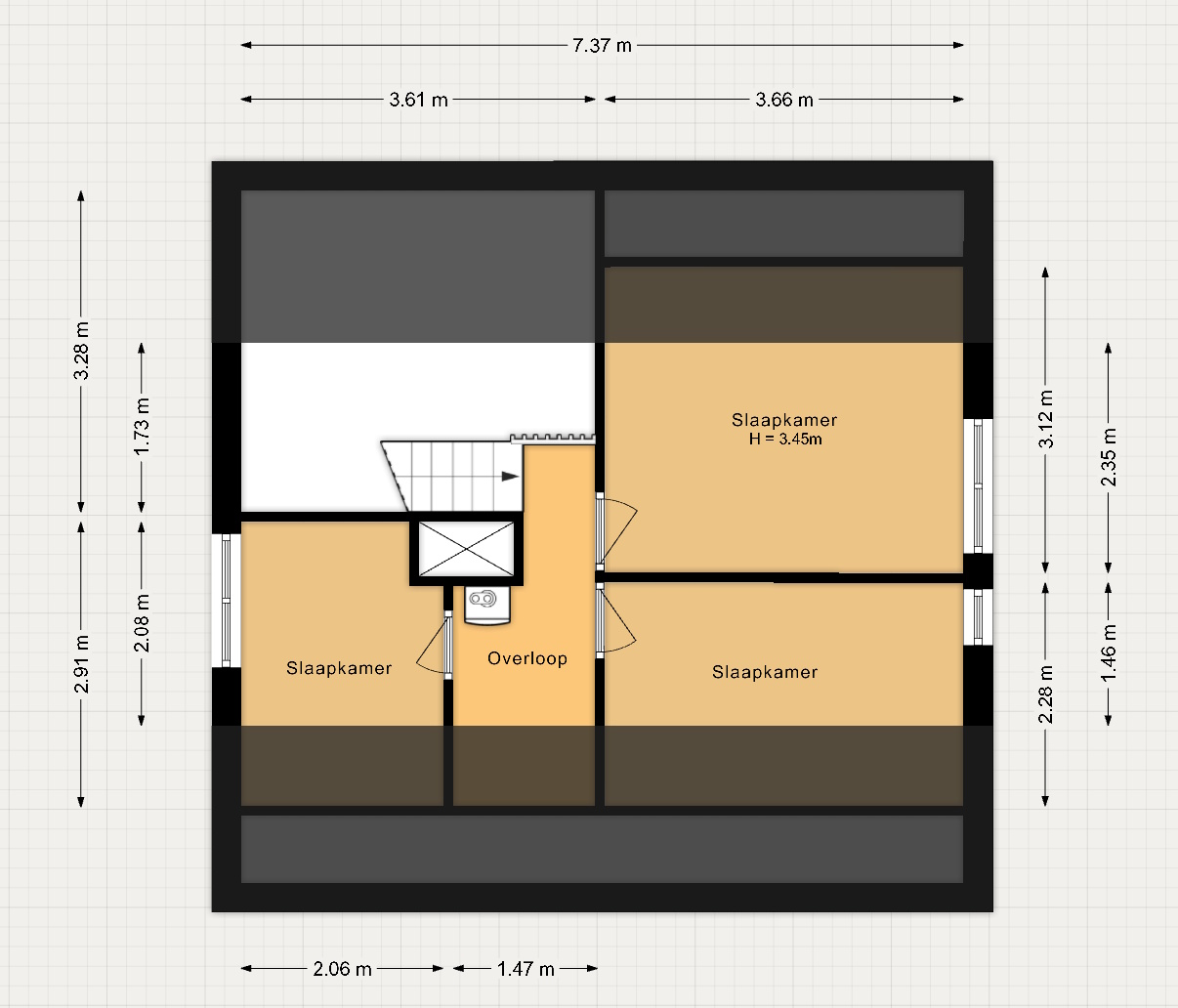 Über Hartholztreppe erreichbar. Flur mit Heizkessel (Bosch). Geräumiges Hauptschlafzimmer mit Kunststoffrahmen und Stauraum hinter Schiebepaneelen. Zweites Schlafzimmer ebenfalls mit Kunststoffrahmen und Stauraum. Kleines drittes Schlafzimmer mit Isolierverglasung.