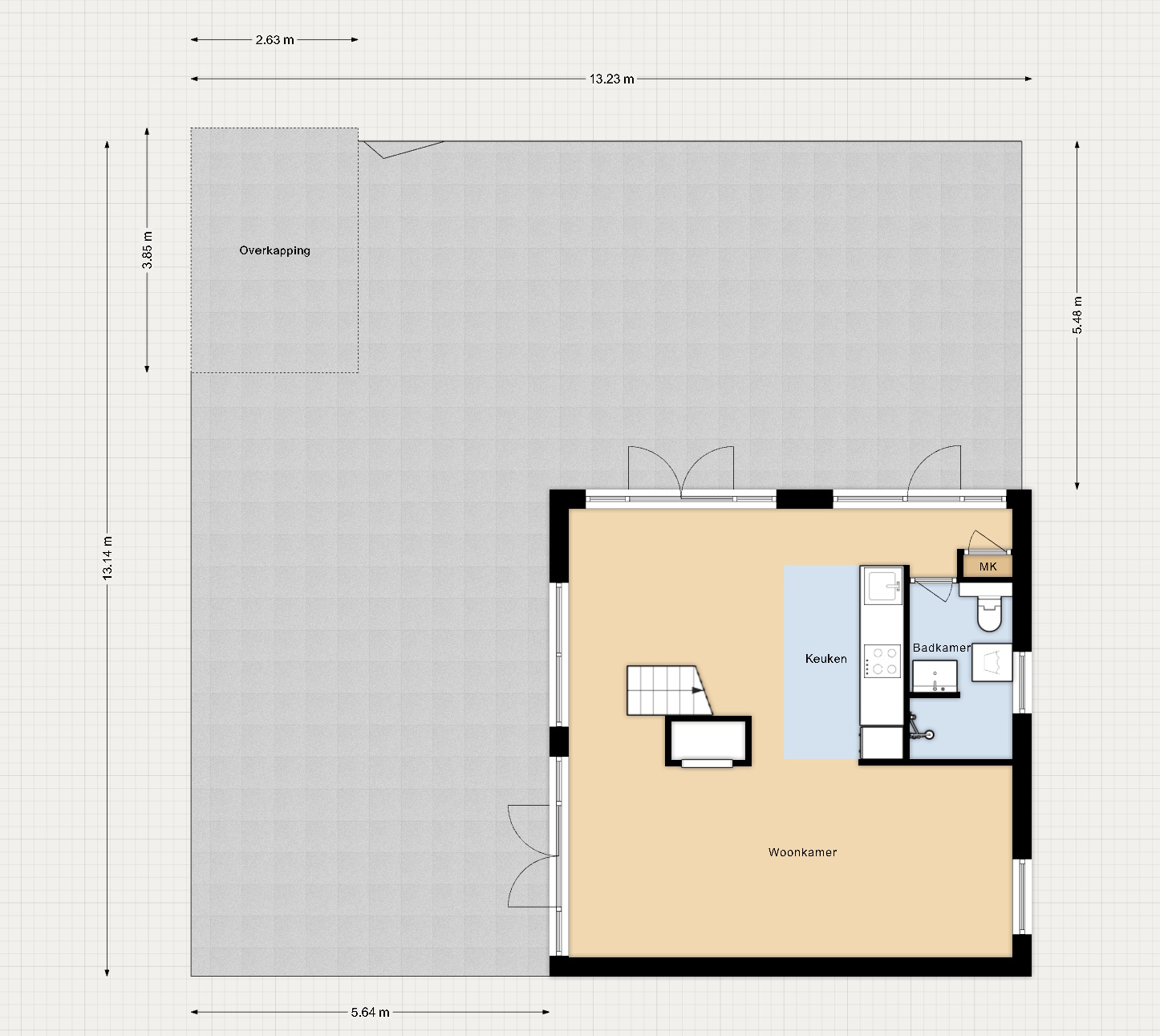 Über Flügeltüren erreichbar. Zwei Terrassen (Sonne und Schatten) und schöne Überdachung mit EPDM-Dach.