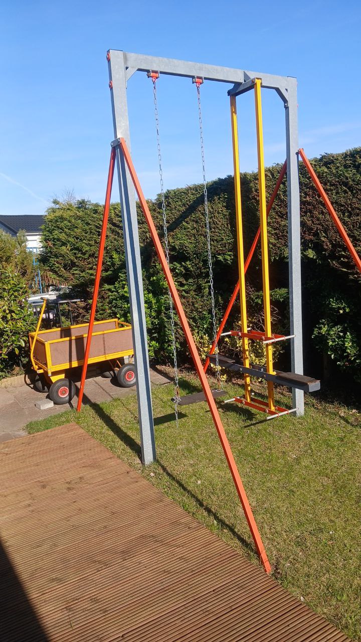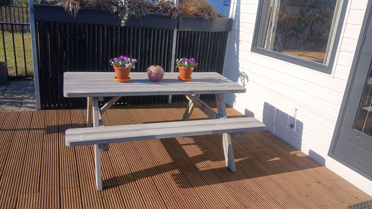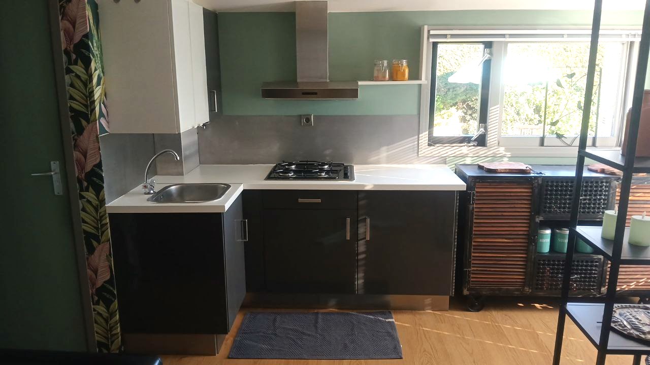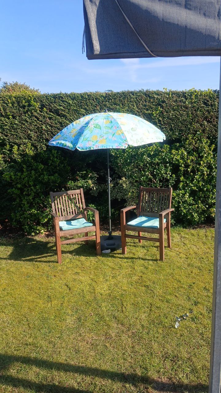 Die hohen Decken verleihen dem Haus ein großzügiges Raumgefühl. Das große Schlafzimmer ist mit einem Doppelbett und einem Kleiderschrank ausgestattet. Im kleinen Zimmer befindet sich eine Waschmaschine; daneben ist Platz für ein Etagenbett. Französische Türen führen auf die Terrasse mit einem anthrazitfarbenen, ausziehbaren Stoffvordach. Neben dem Haus befinden sich ein Gartenhaus, eine Rasenfläche, eine Schaukel und eine hohe Hecke für Privatsphäre.