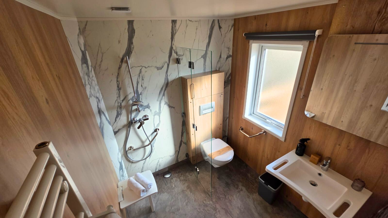 Das Badezimmer verfügt außerdem über ein Waschbecken mit Spiegel, eine Toilette sowie praktische Aufbewahrungsmöglichkeiten. Durch die durchdachte Raumaufteilung und die großzügige Gestaltung ist ausreichend Bewegungsfreiheit vorhanden, was den Raum besonders benutzerfreundlich macht.