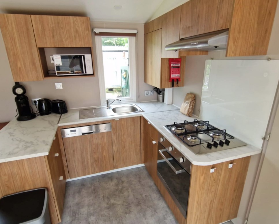 De open U-vormige keuken is ruim en overzichtelijk, met een open zijkant naar de woonkamer. De keuken is uitgerust met een ingebouwde vaatwasser, koelkast met vriesvak, magnetron, koffiezetapparaat en veel kastruimte – ideaal voor langere verblijven.