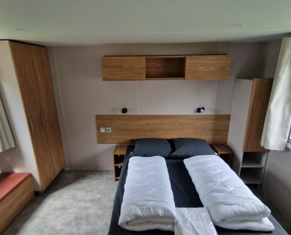 De masterbedroom beschikt over een tweepersoonsbed, ruime opbergruimte en een handige hoekbureau – perfect voor wie af en toe wil werken of lezen. Daarnaast heeft deze slaapkamer een directe privétoegang tot een ensuite toilet en badkamer.