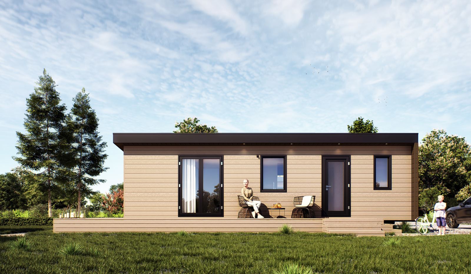 De woonkamer is een lichte en ruime omgeving, afgewerkt met een moderne visgraatvloer die warmte en stijl toevoegt aan de ruimte. Grote ramen bieden een panoramisch uitzicht, waardoor binnen en buiten naadloos in elkaar overlopen en je volop kunt genieten. De ruimte is strak afgewerkt in neutrale tinten, wat een rustige sfeer creëert. In de hoek bevindt zich een stijlvolle, zwarte radiator die past bij het moderne design. Deze woonkamer biedt een perfecte combinatie van comfort, stijl en verbinding met de natuur.