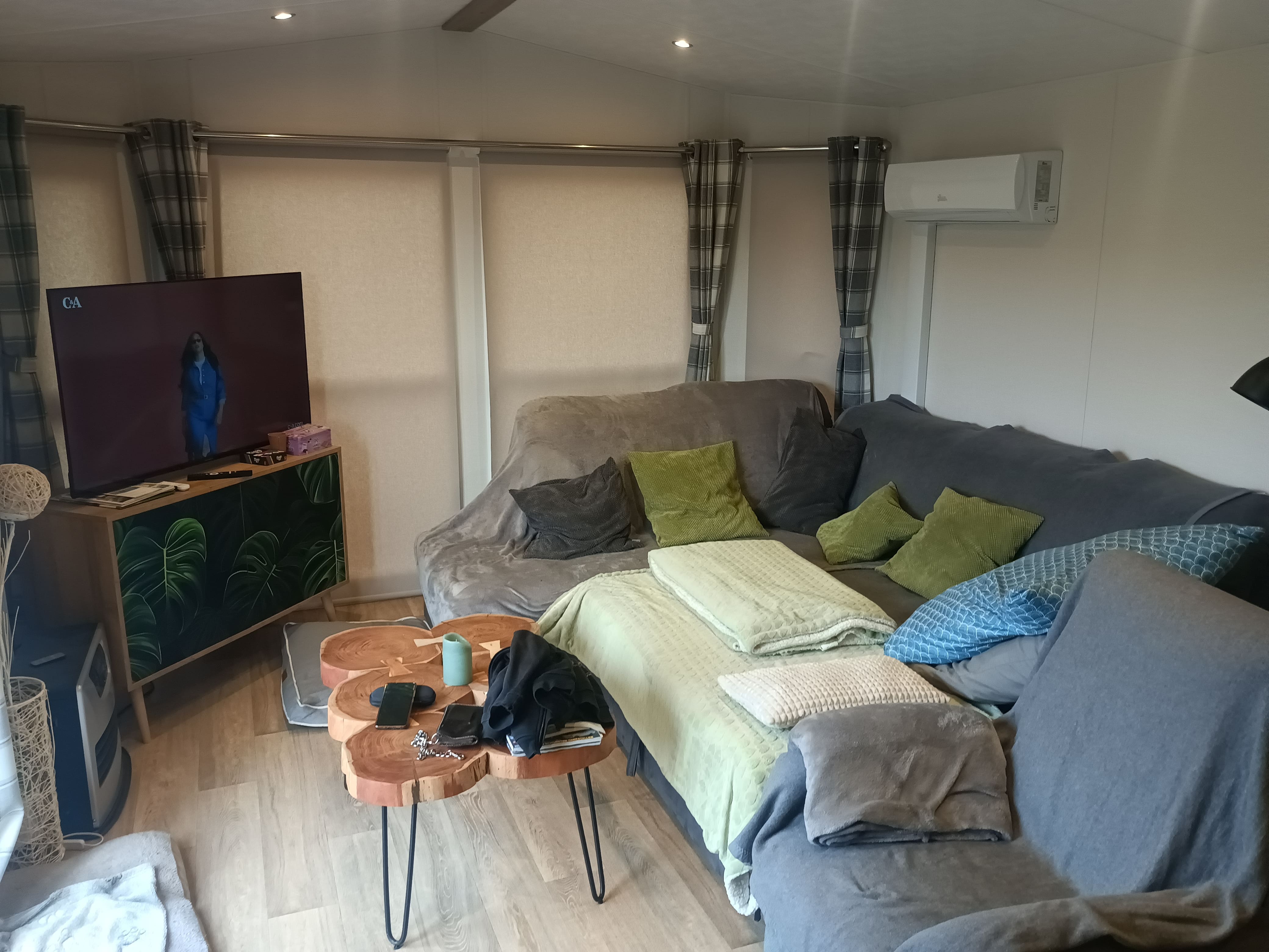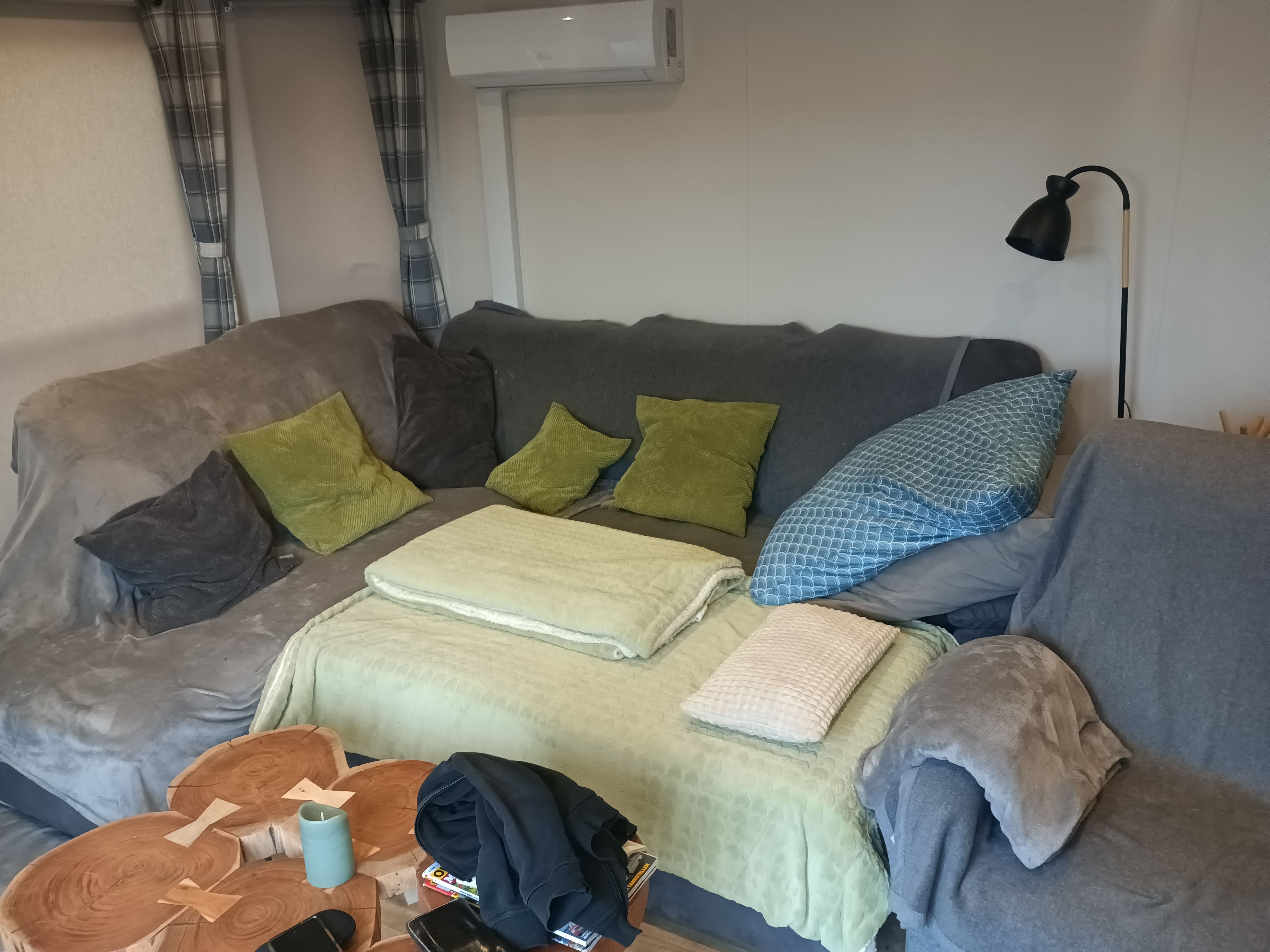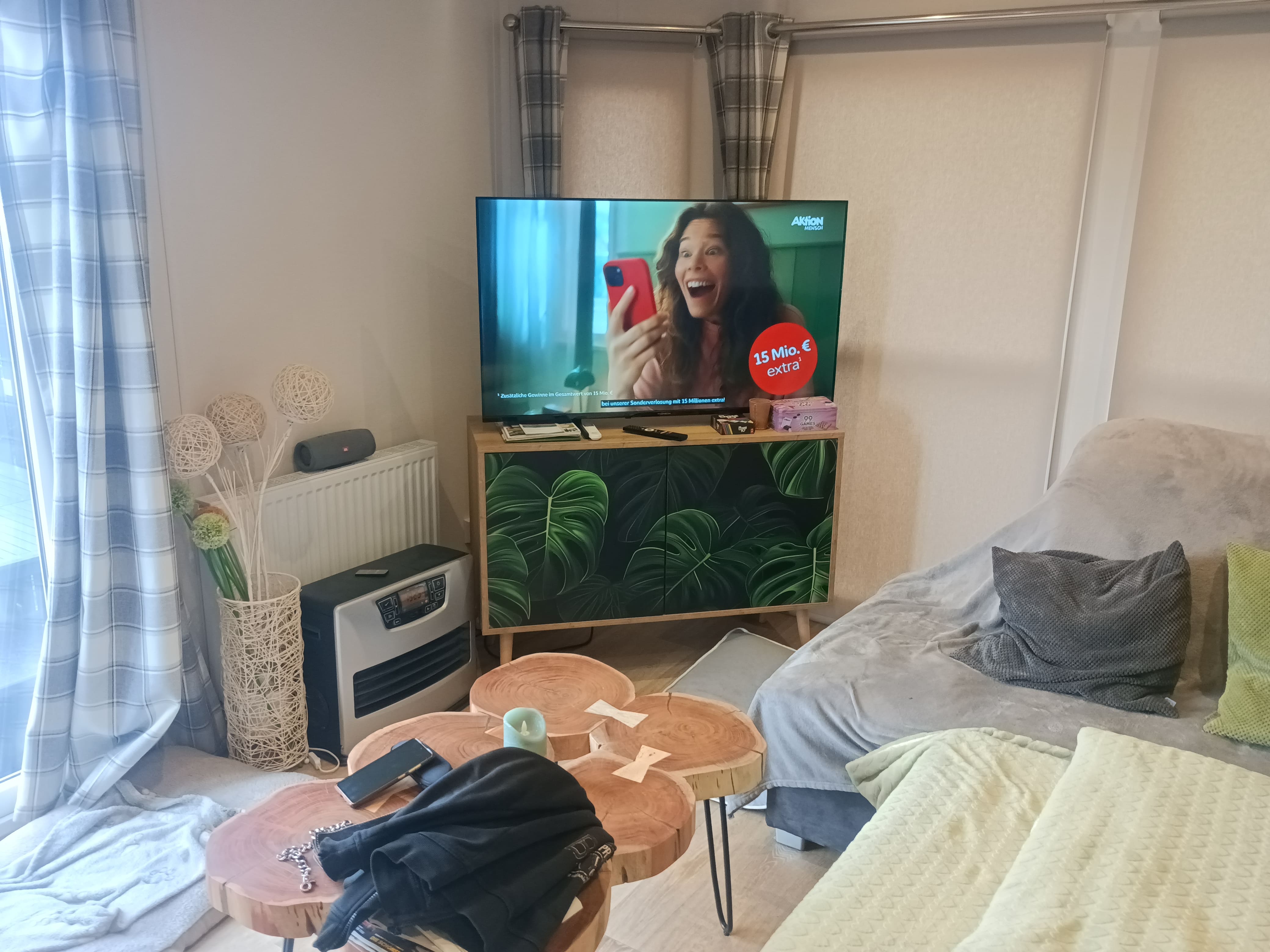 Wohnzimmer mit L-Couchgarnitur und Schlaffunktion. Fernseher mit Sat Anlage, Große Fensterfront!