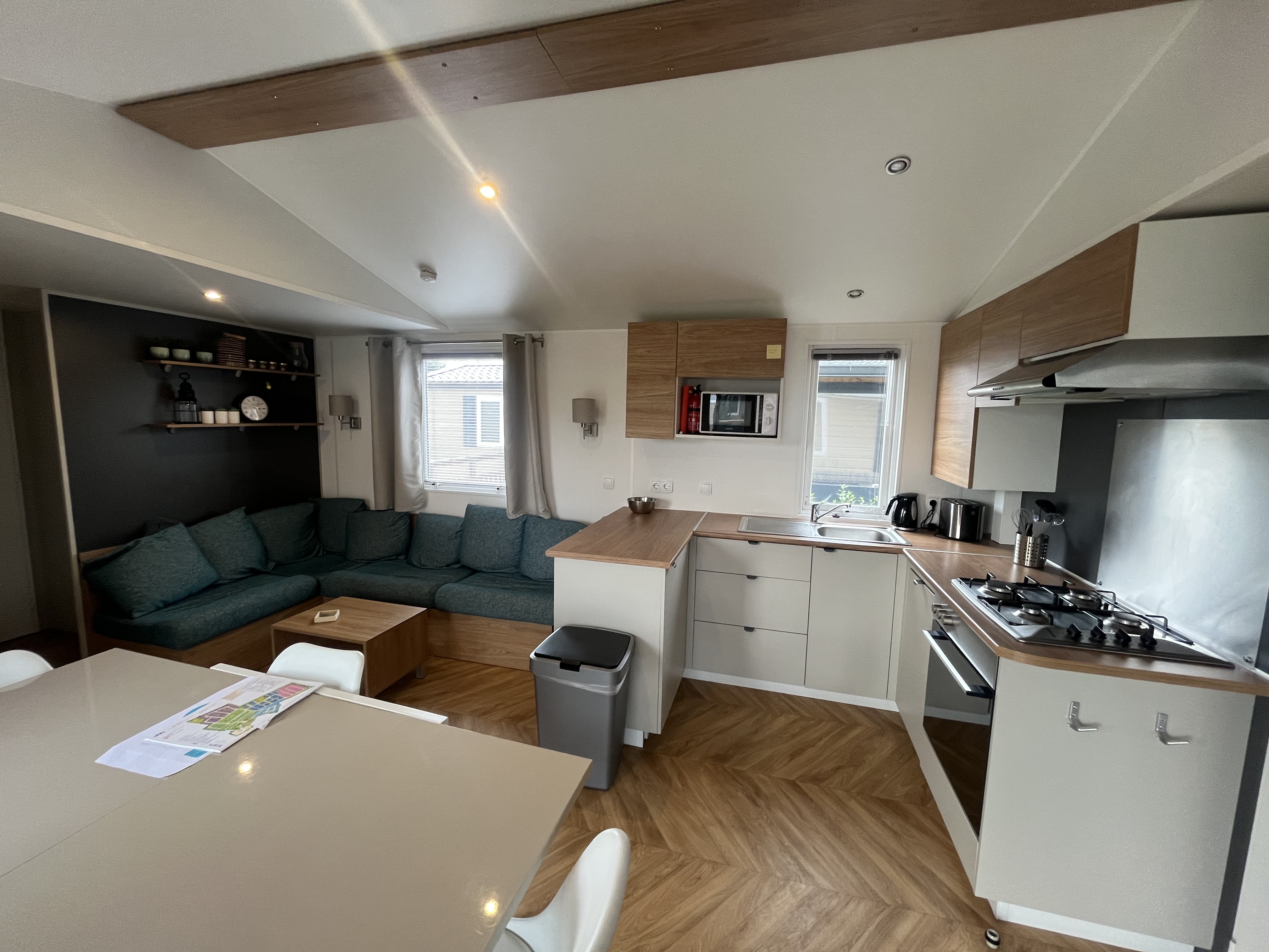Ruime, functionele U-keuken, compleet met een roestvrijstalen gasoven en geïntegreerde vaatwasser. Alles wat je nodig hebt voor een ontspannen verblijf is aanwezig.