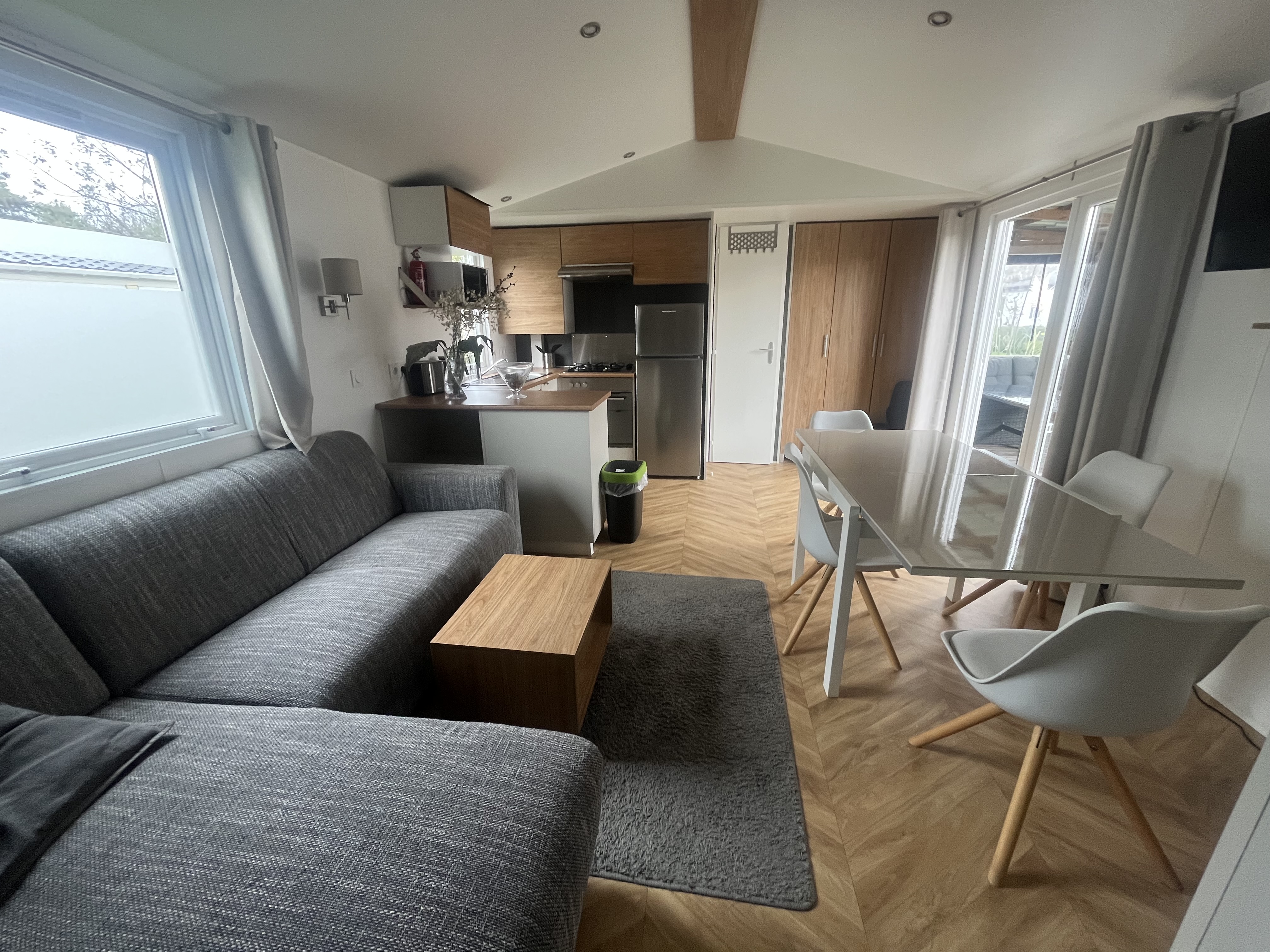 Binnen stap je in een ruime leefruimte met directe toegang tot het zonnige terras – perfect voor lange zomeravonden of een kop koffie in de ochtendzon. De gezellige woonkamer is ingericht met een comfortabele L-vormige bank.