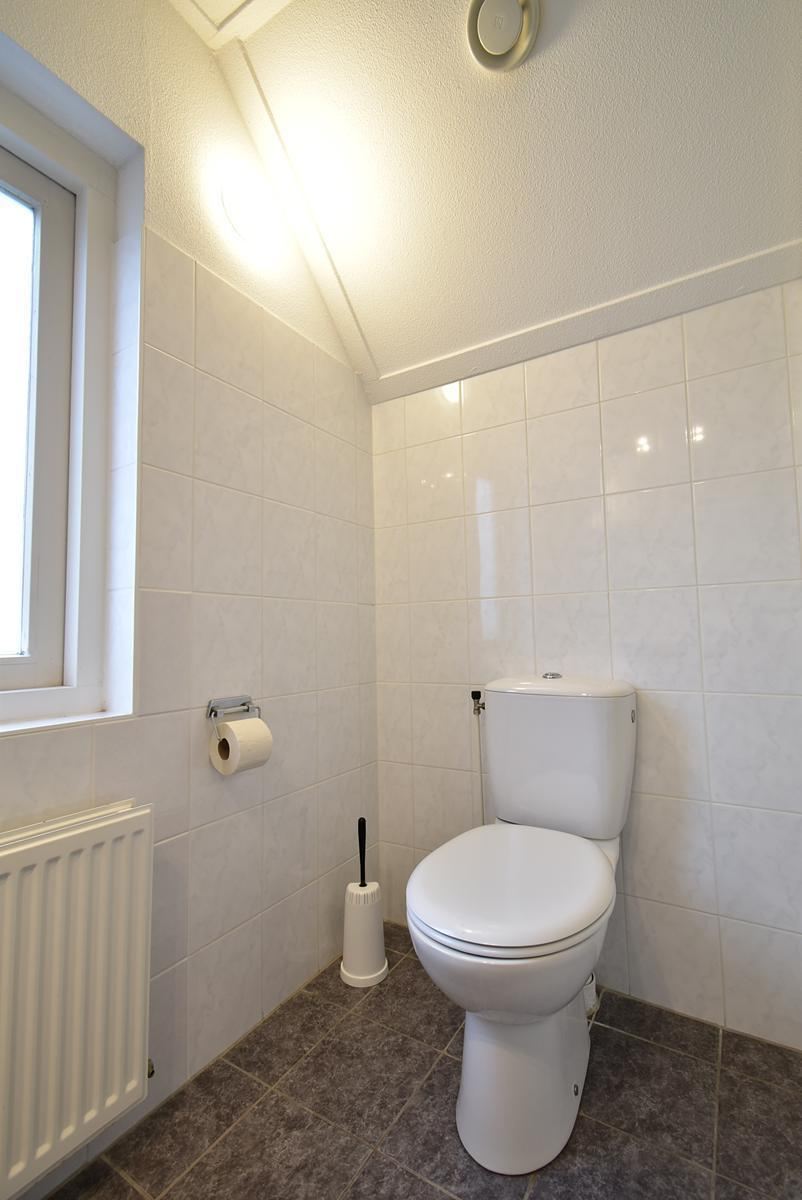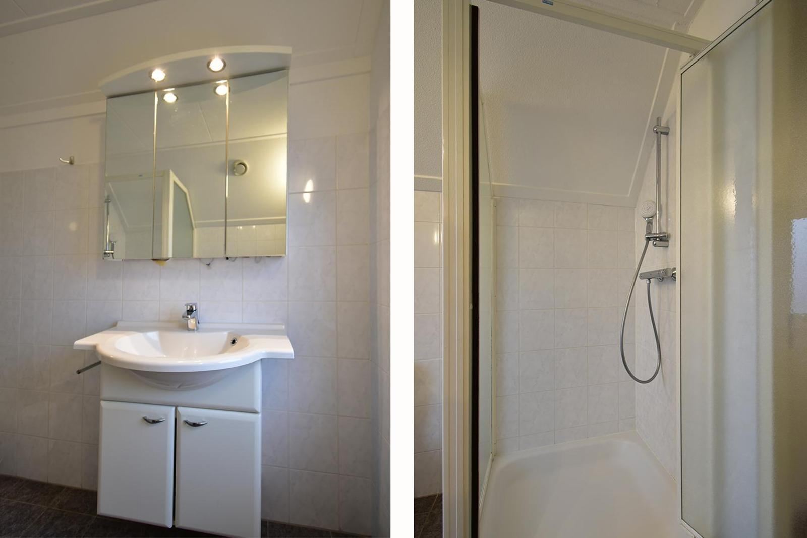De badkamer op de verdieping is volledig betegeld en voorzien van een douchecabine, wastafelmeubel en tweede toilet. Het wastafelmeubel biedt opbergruimte voor toiletspullen, terwijl de spiegelkast met verlichting zorgt voor extra gemak. Dankzij het raam is er daglicht en natuurlijke ventilatie. De combinatie van douche en toilet op dezelfde verdieping als de slaapkamers is praktisch voor gebruik met zes personen.