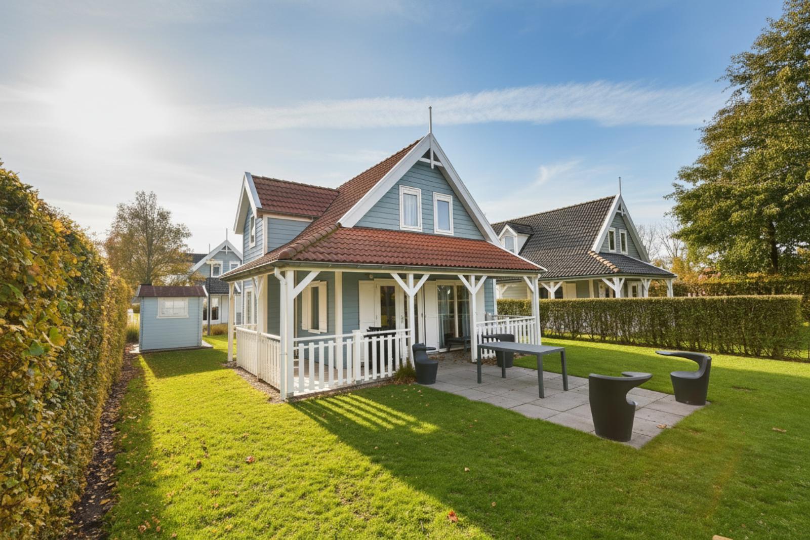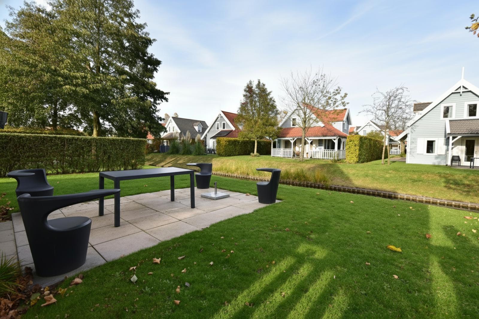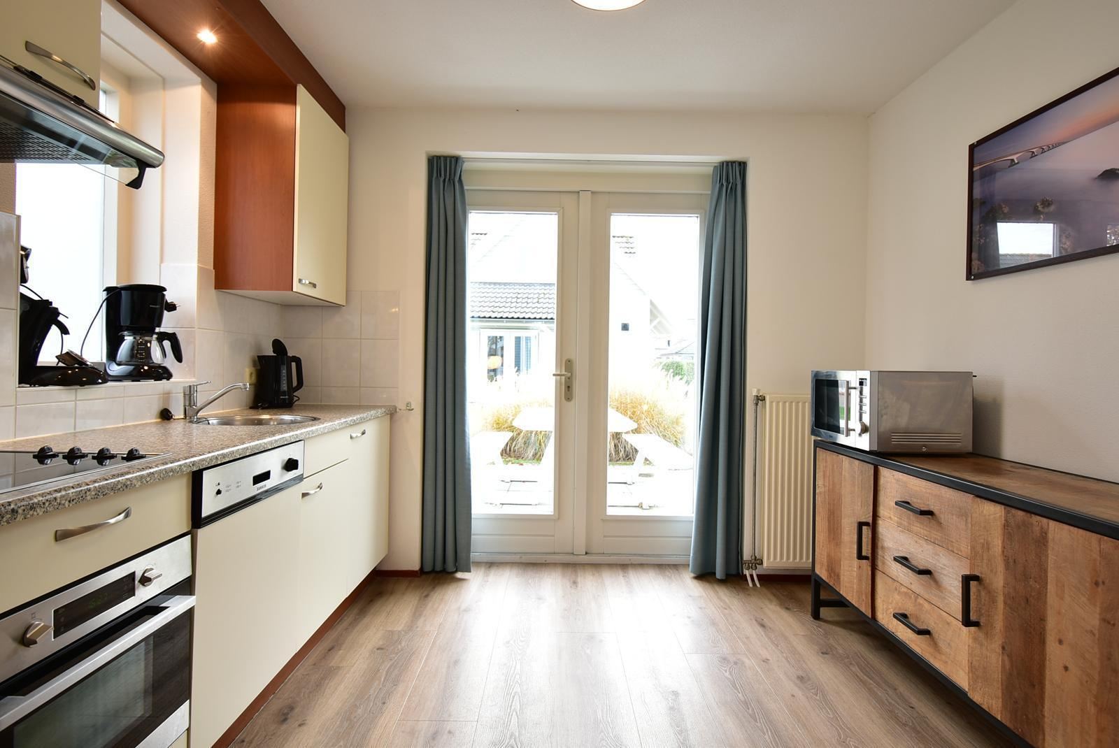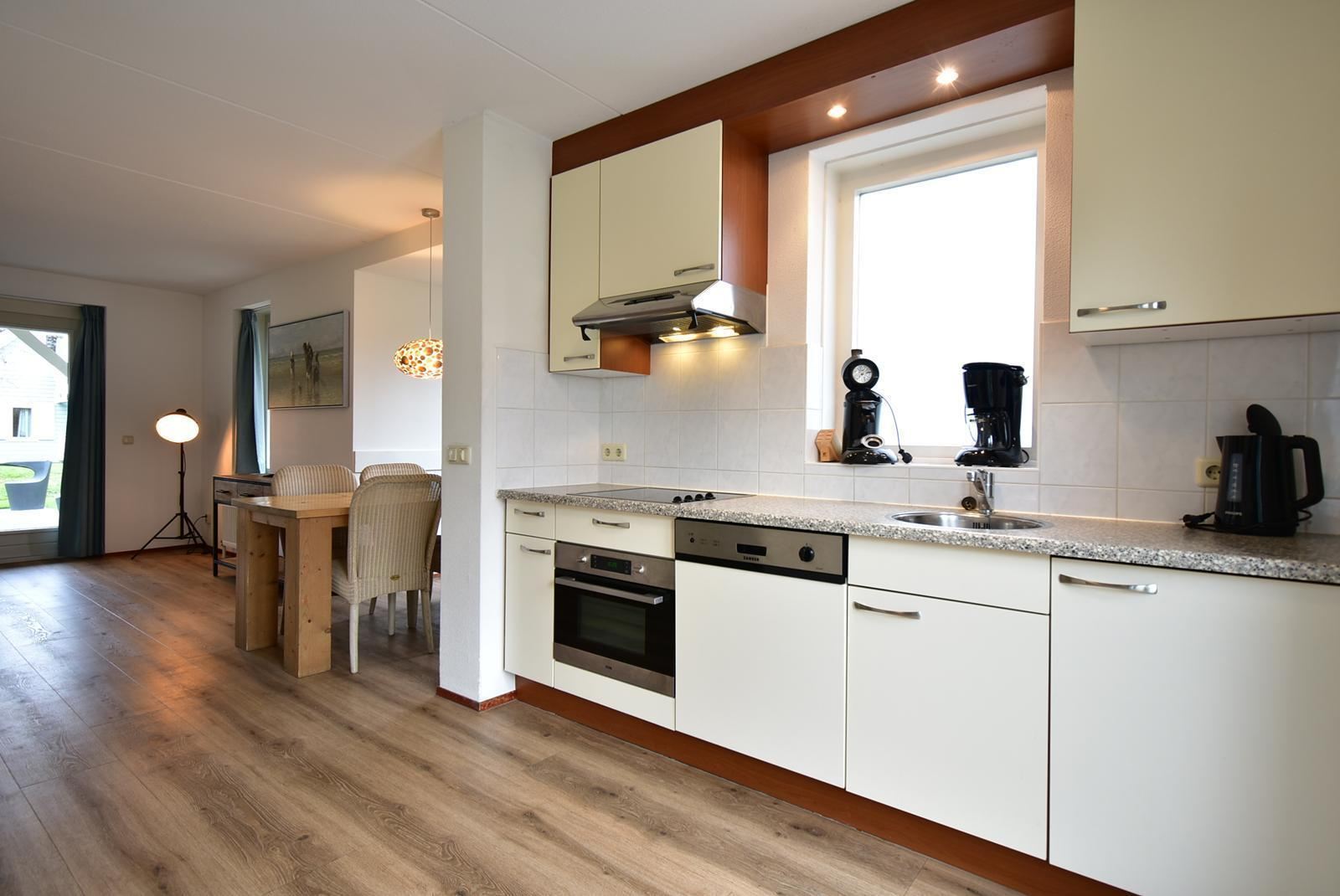 De open keuken ligt direct naast de eethoek en heeft een praktische rechte opstelling. Je beschikt over een kookplaat, afzuigkap, combimagnetron, vaatwasser, koelkast en voldoende kastruimte. Het aanrechtblad biedt genoeg werkruimte om maaltijden voor zes personen te bereiden. Dankzij het raam boven het aanrecht en de tuindeuren naar het terras is de keuken lekker licht en heb je direct contact met buiten.