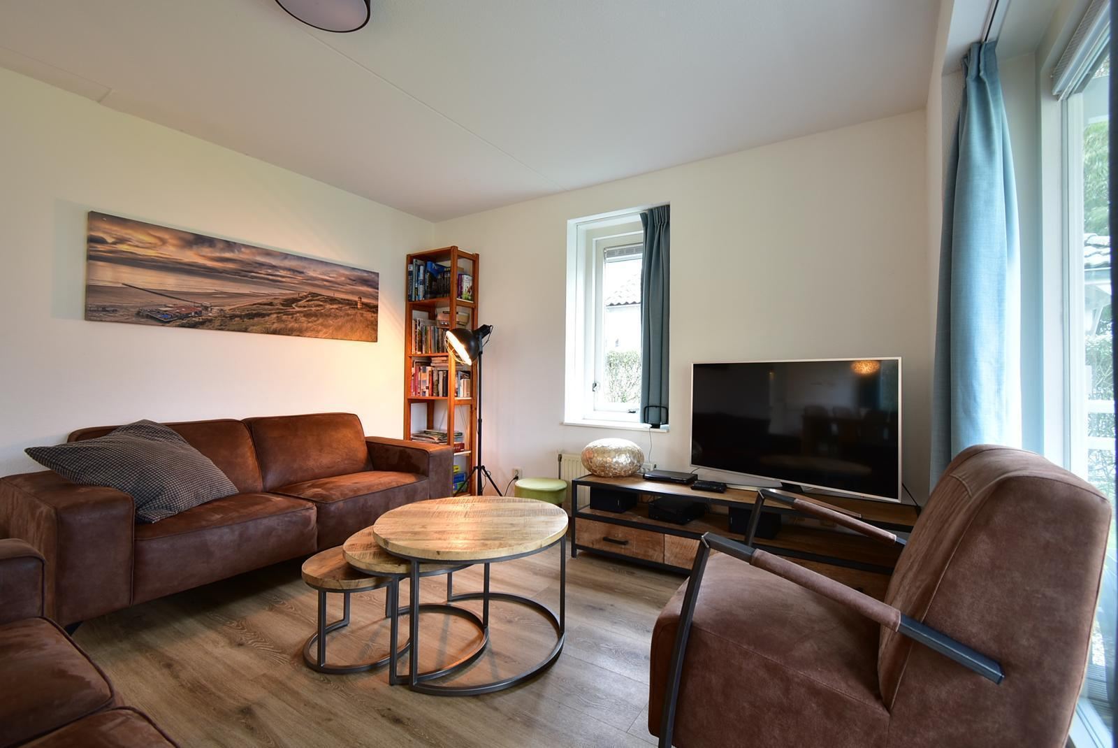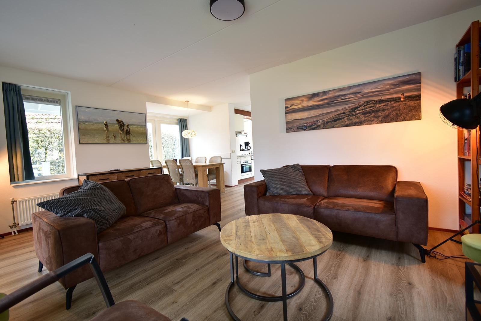 De woonkamer is licht en ruim dankzij de vele ramen en dubbele tuindeuren naar de veranda. De zithoek met twee comfortabele banken en fauteuils kijkt uit op de tuin. De houten salontafels en het pvc in houtlook zorgen voor een warme sfeer. Aan de andere zijde van de ruimte staat een grote eettafel met zes stoelen bij het raam, waardoor je tijdens het eten mooi uitkijkt op het groen rondom de woning.