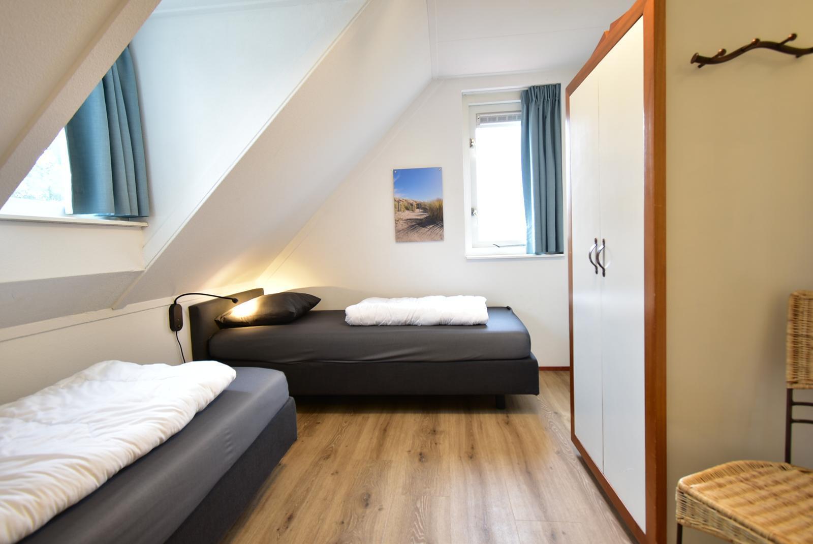 Slaapkamer 2 is ingericht met twee eenpersoonsbedden en een kledingkast. De schuine kap geeft de kamer een knusse sfeer, terwijl het raam voor daglicht en ventilatie zorgt. Deze slaapkamer is ideaal als kinderkamer of logeerkamer voor gasten. Door de praktische indeling blijft er voldoende loopruimte over, ook wanneer de bedden zijn opgemaakt.