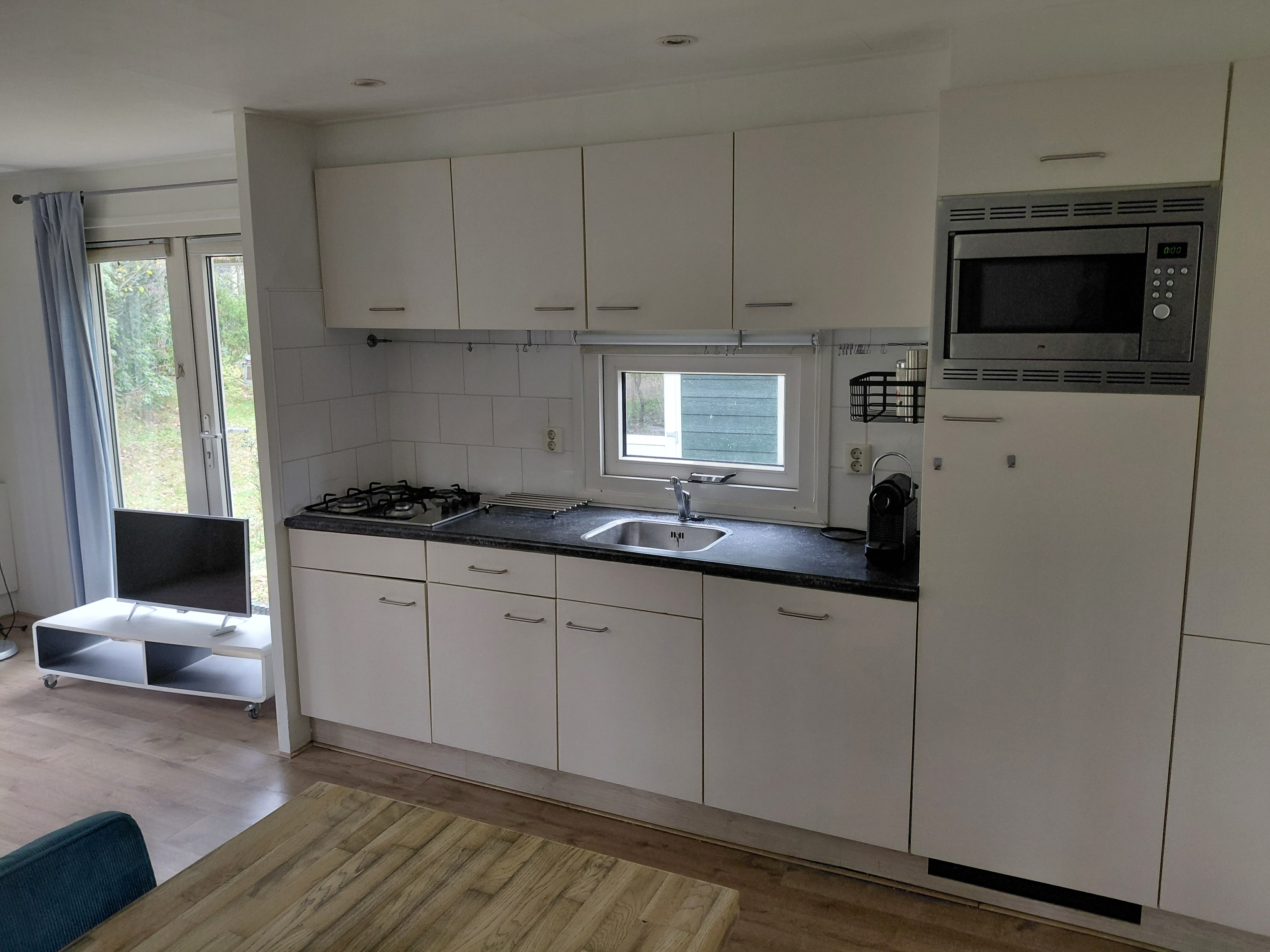 Chalet van 32 m2 met 1 slaapkamer en toilet/ doucheruimte + losstaande berging/fietsenhok.
