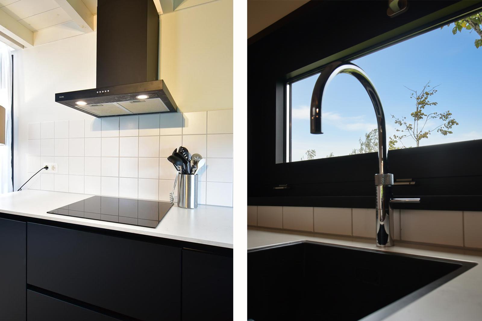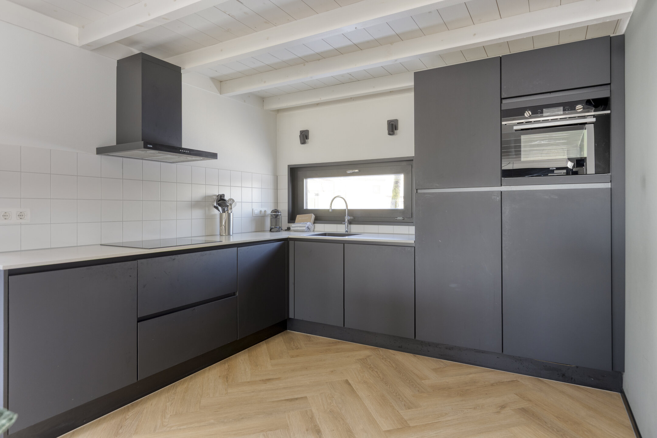 De keuken is strak uitgevoerd met donkere fronten en een ruim werkblad. De opstelling is praktisch, met kookplaat en afzuiging en een spoelgedeelte bij het raam. Wat dacht u van een Quoocker. Heerlijk voor het gemak.