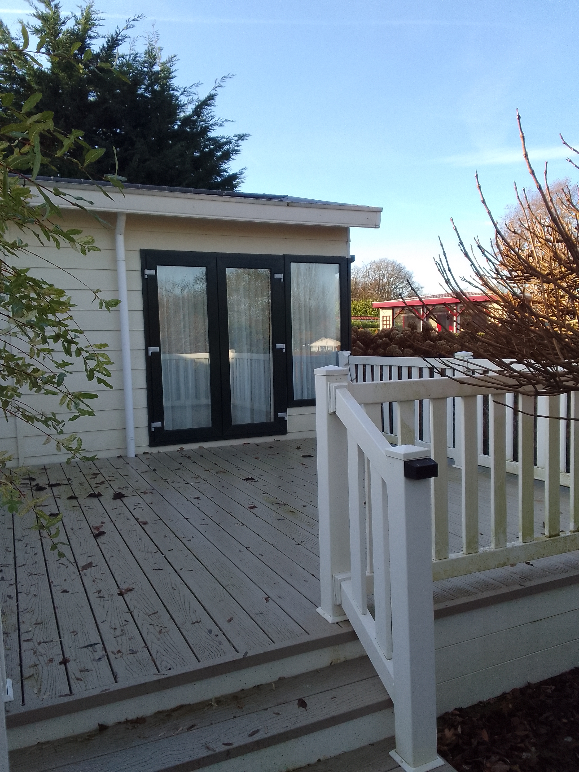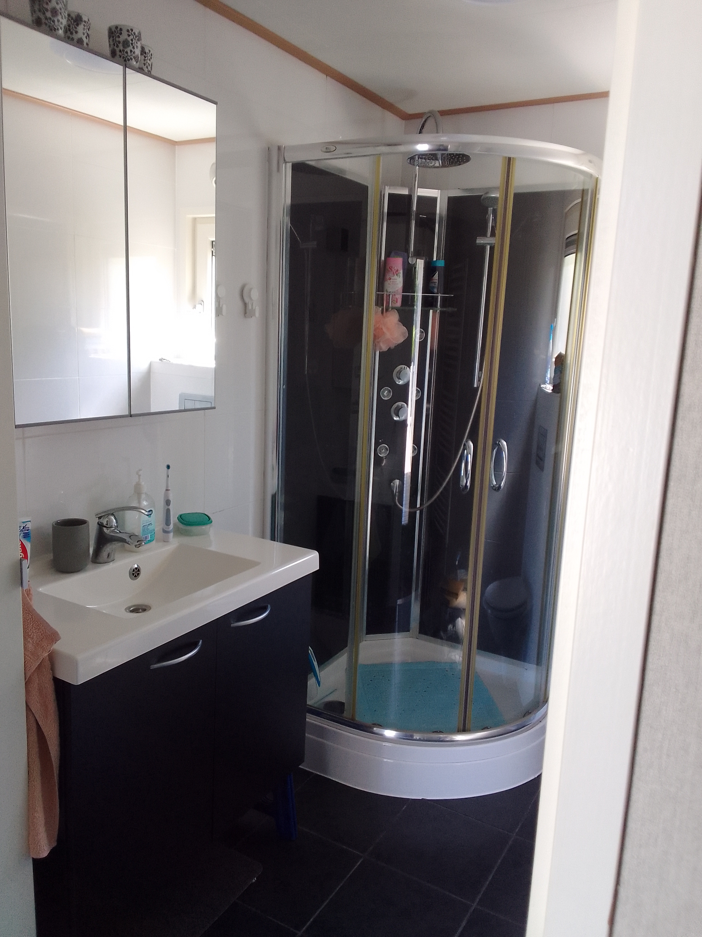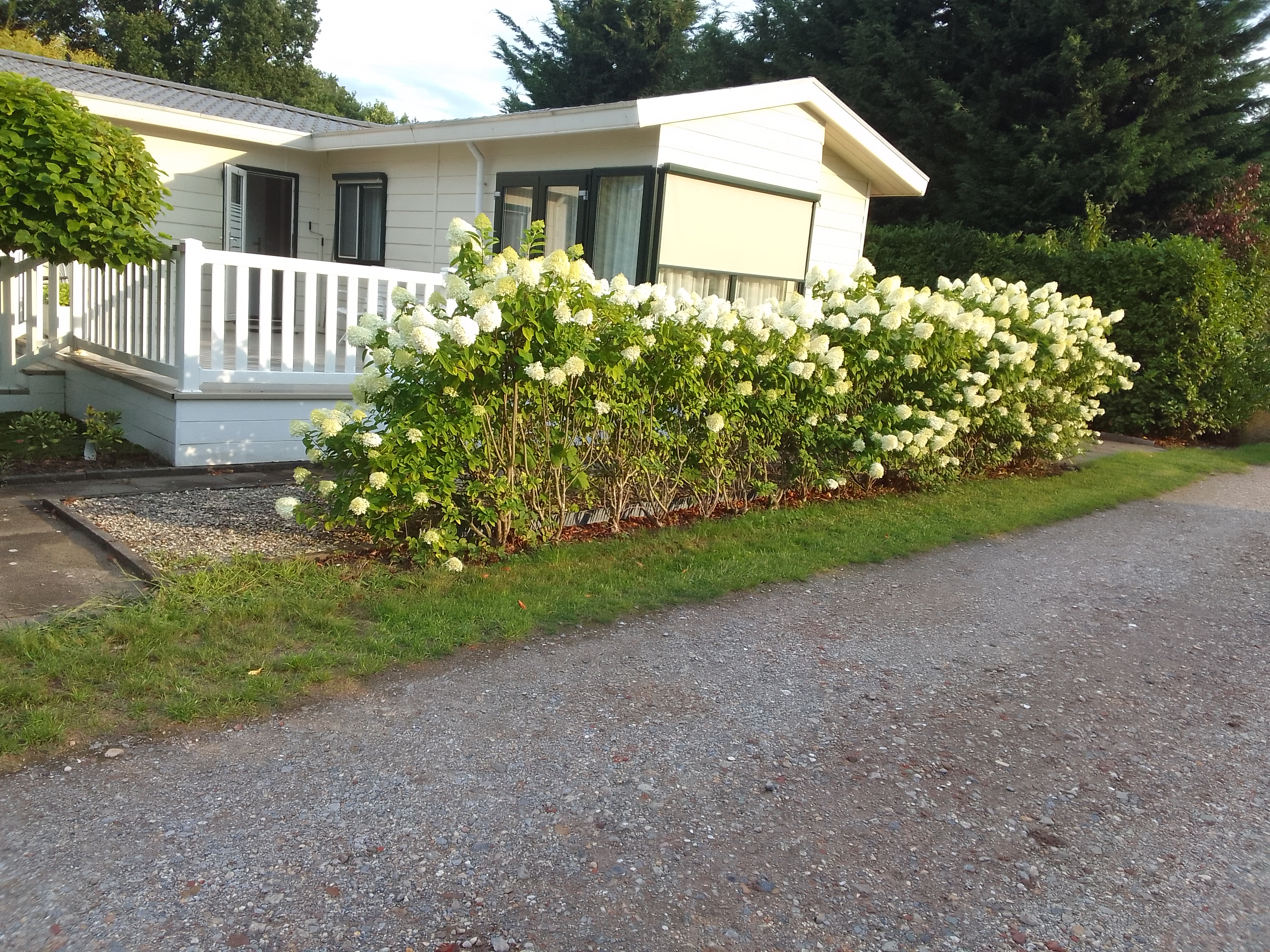 Mooi, goed onderhouden L-chalet op 400m2 huurplaats op park De Haspel, Hoeven. Veel privacy, zon- en schaduwplekken.