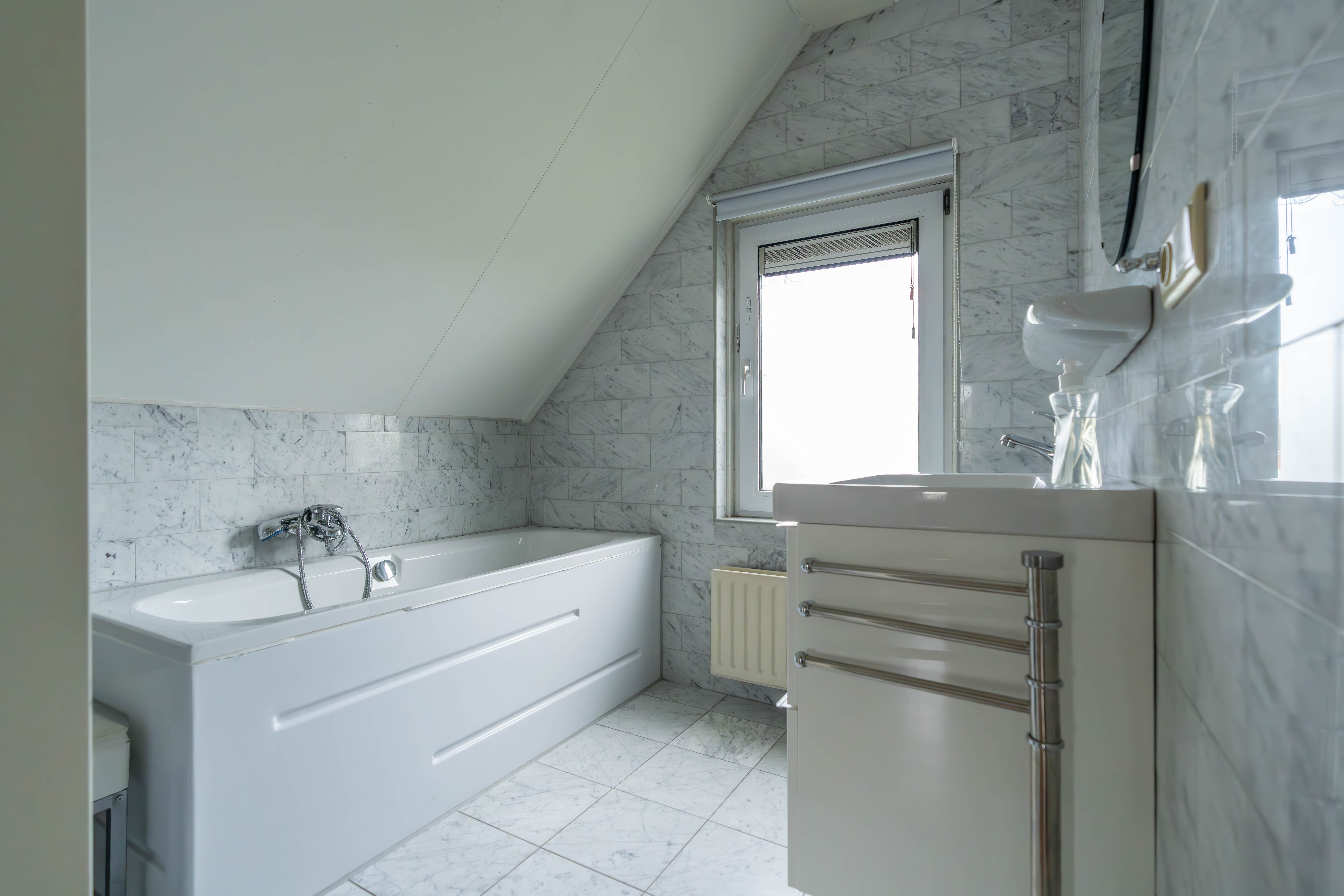 De eerste badkamer is zeer compleet ingericht en biedt de luxe van een ruim ligbad, ideaal voor ontspanning na een actieve vakantiedag. In deze ruimte bevindt zich tevens een wit wastafelmeubel met lades en een radiator, terwijl een raam zorgt voor prettig natuurlijk lichtinval en de mogelijkheid tot ventilatie.