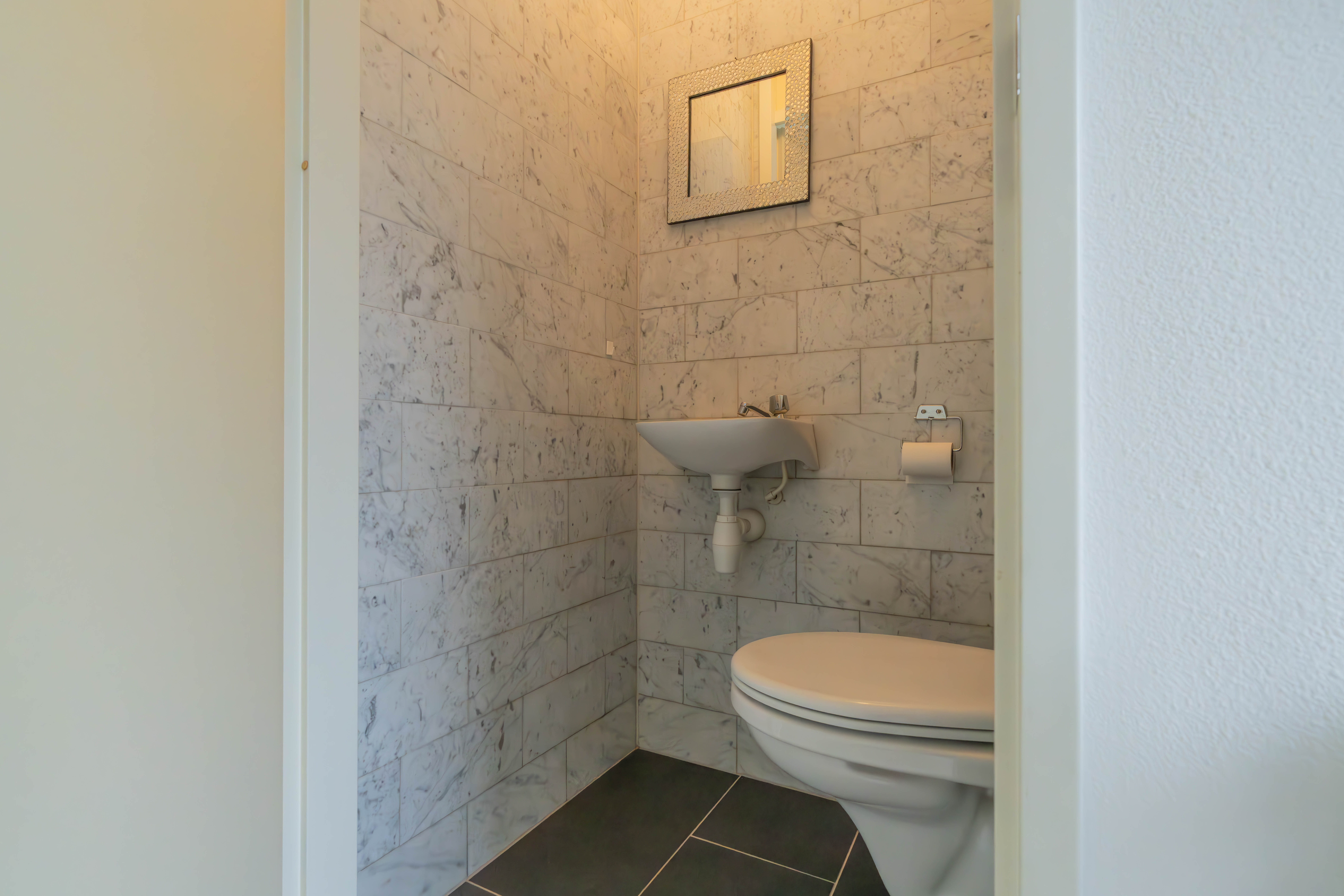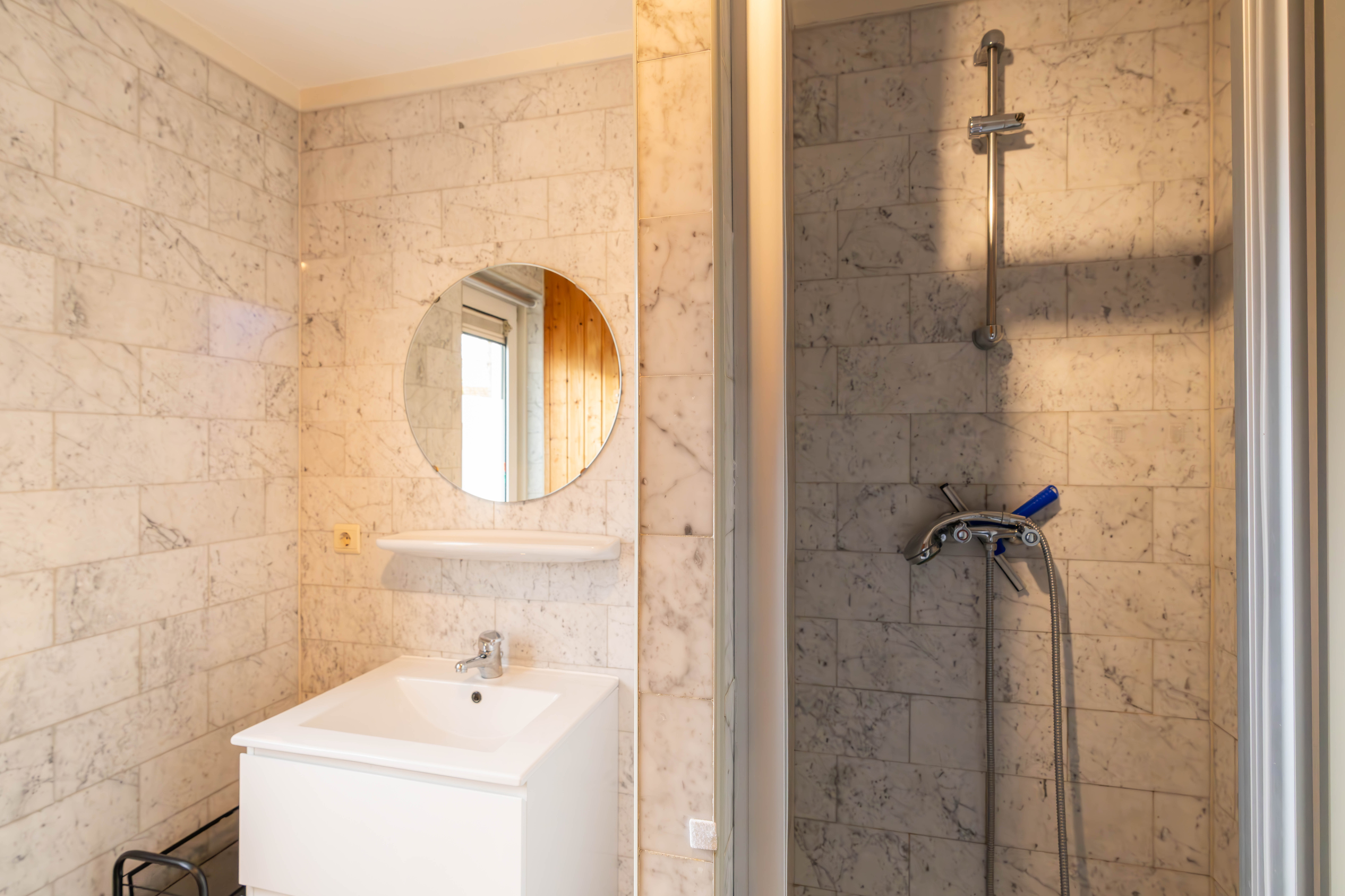De tweede badkamer is eveneens voorzien van tegel afwerking en richt zich meer op het praktische gemak met een aparte douchegelegenheid. Ook deze ruimte beschikt over een strak wastafelmeubel met een ronde spiegel en een planchet voor toiletartikelen. Door de aanwezigheid van zowel een bad als een douche in de woning is er voor ieder wat wils en is het huis uitstekend uitgerust voor een verblijf met meerdere personen.