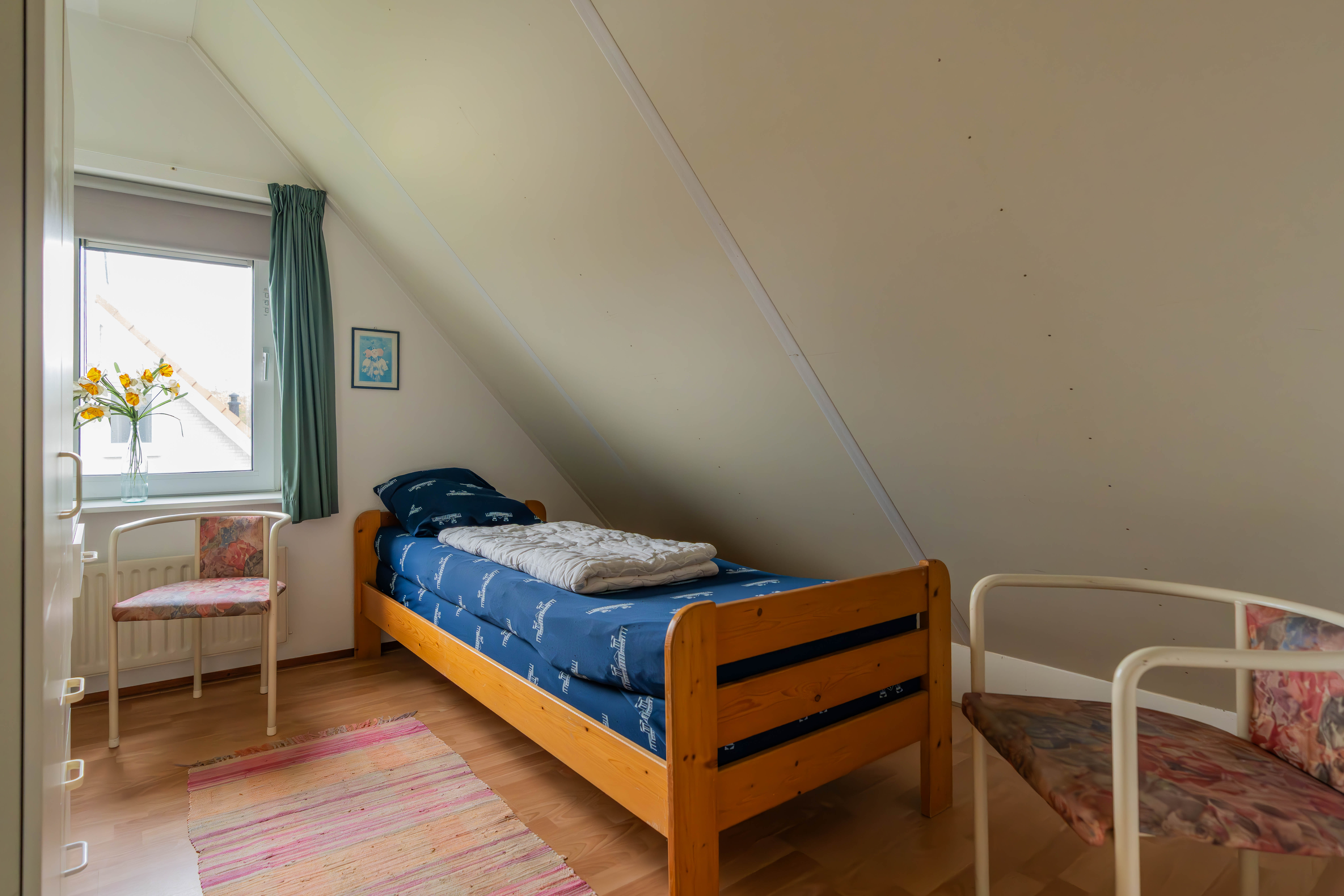 Deze kamer bevindt zich eveneens op de eerste verdieping en is ingericht met een comfortabel eenpersoonsbed. Ondanks de schuine daklijn voelt de kamer licht en ruimtelijk aan.