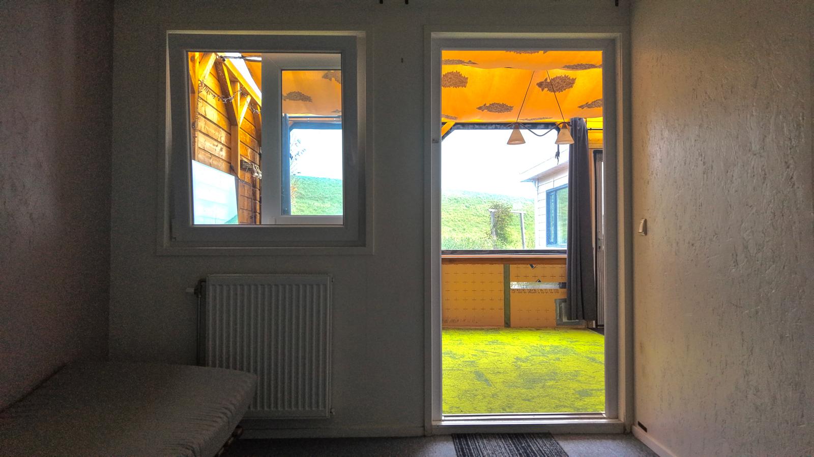 Veranda: De ramen hebben doorzichtig zeil die men in de zomer kan open zetten en in de winter afneembaar Plexi glas om voor de ramen te plaatsen.