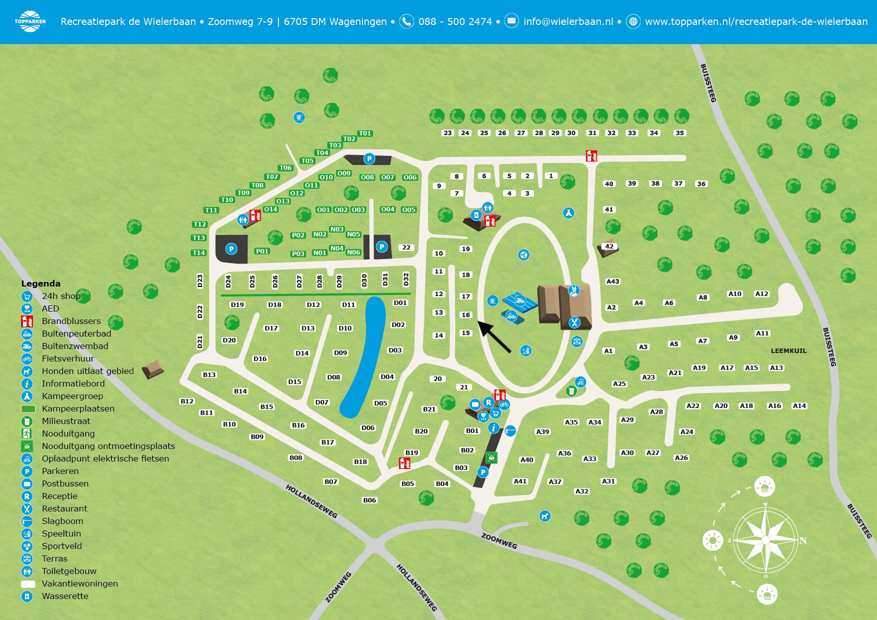 Afhaal maaltijden, Bistro, Café - Bar, Cafetaria, Fietsverhuur, Huisdieren toegestaan, Kindvriendelijk, Restaurant, Speeltuin, Wasserette, Wifi, Zwembad