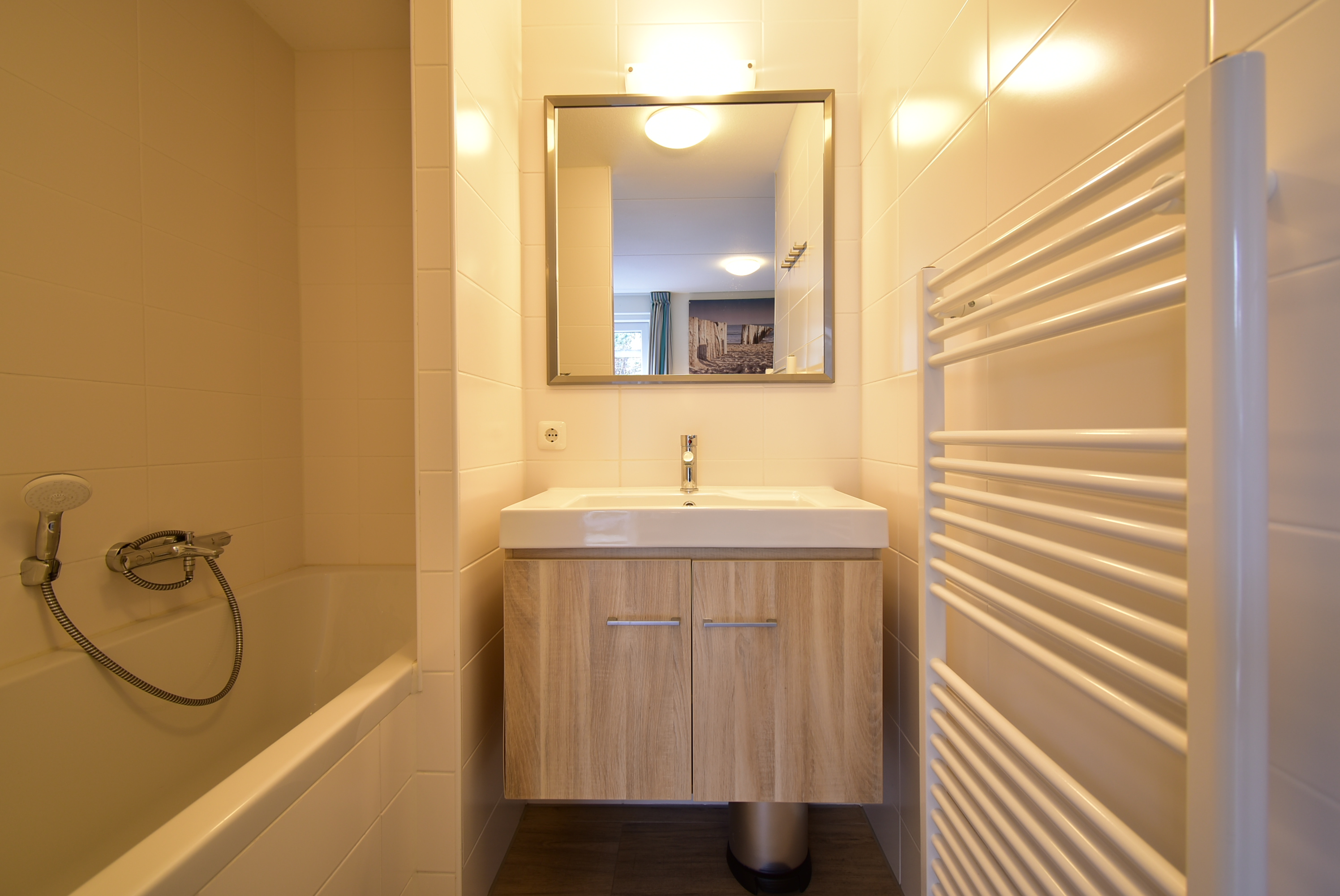 De ensuite badkamer, die direct verbonden is met de master bedroom, heeft een moderne en frisse uitstraling met volledig betegelde witte wanden. De ruimte is praktisch ingericht met een eigentijds wastafelmeubel in een lichte houtoptiek, voorzien van twee kastjes en een strakke witte wasbak. Boven de wastafel hangt een grote spiegel met een verlichtingsarmatuur, wat zorgt voor prettig werklicht. Voor optimaal comfort is de badkamer uitgerust met een ligbad met douchecombinatie. De vloer is voorzien van een nette vloer met houtstructuur die doorloopt vanuit de slaapkamer, en er is een witte designradiator aanwezig voor het verwarmen van handdoeken.
