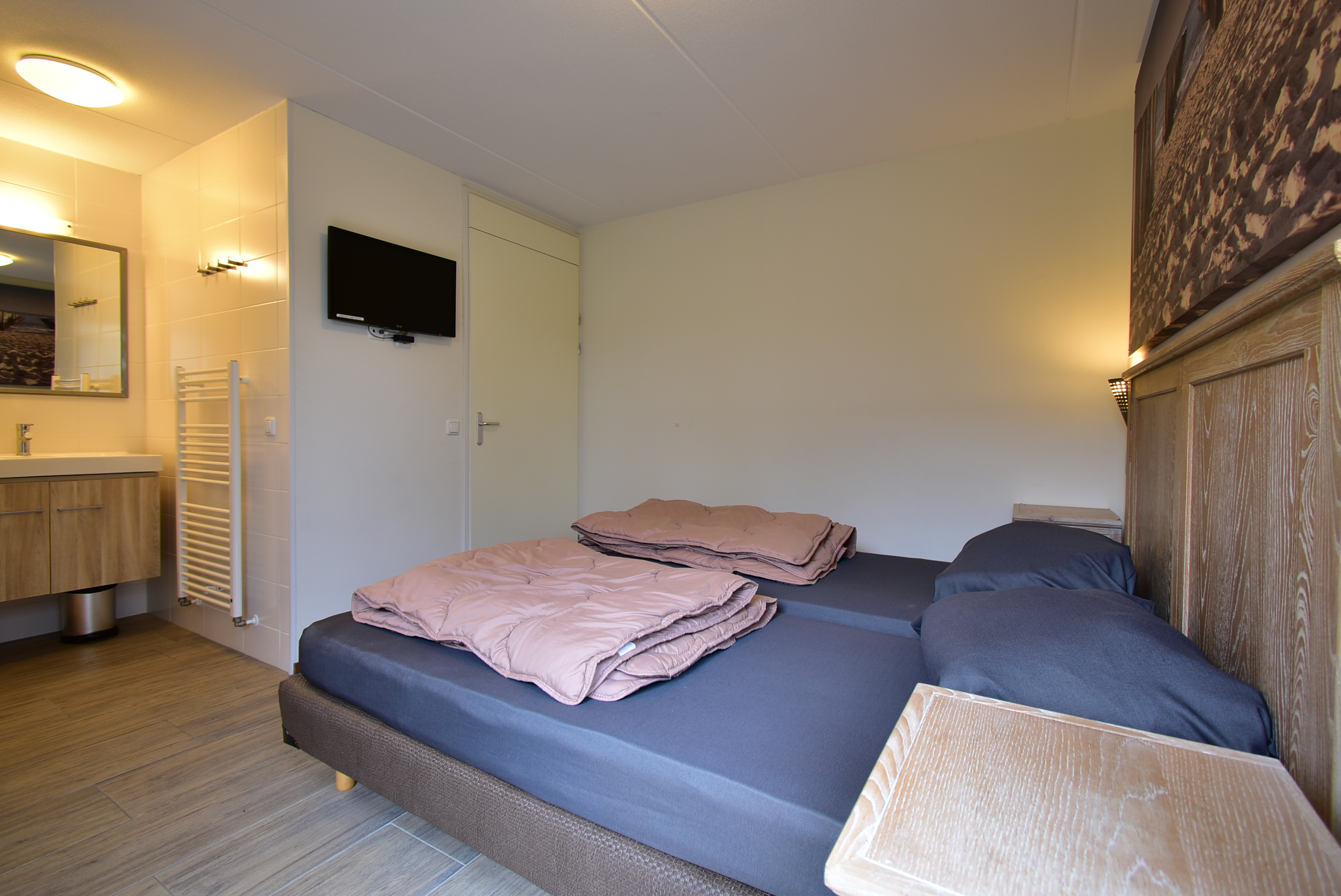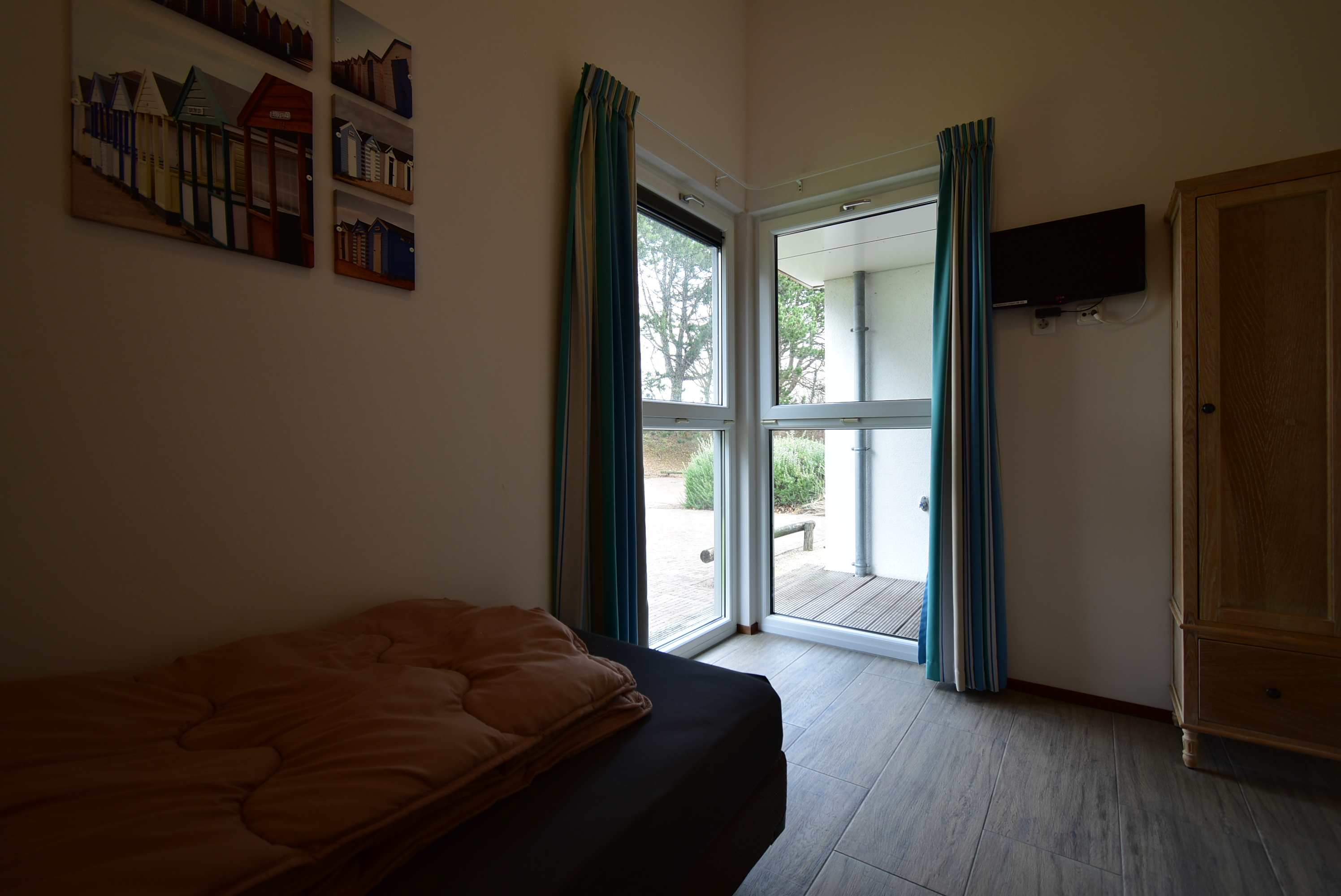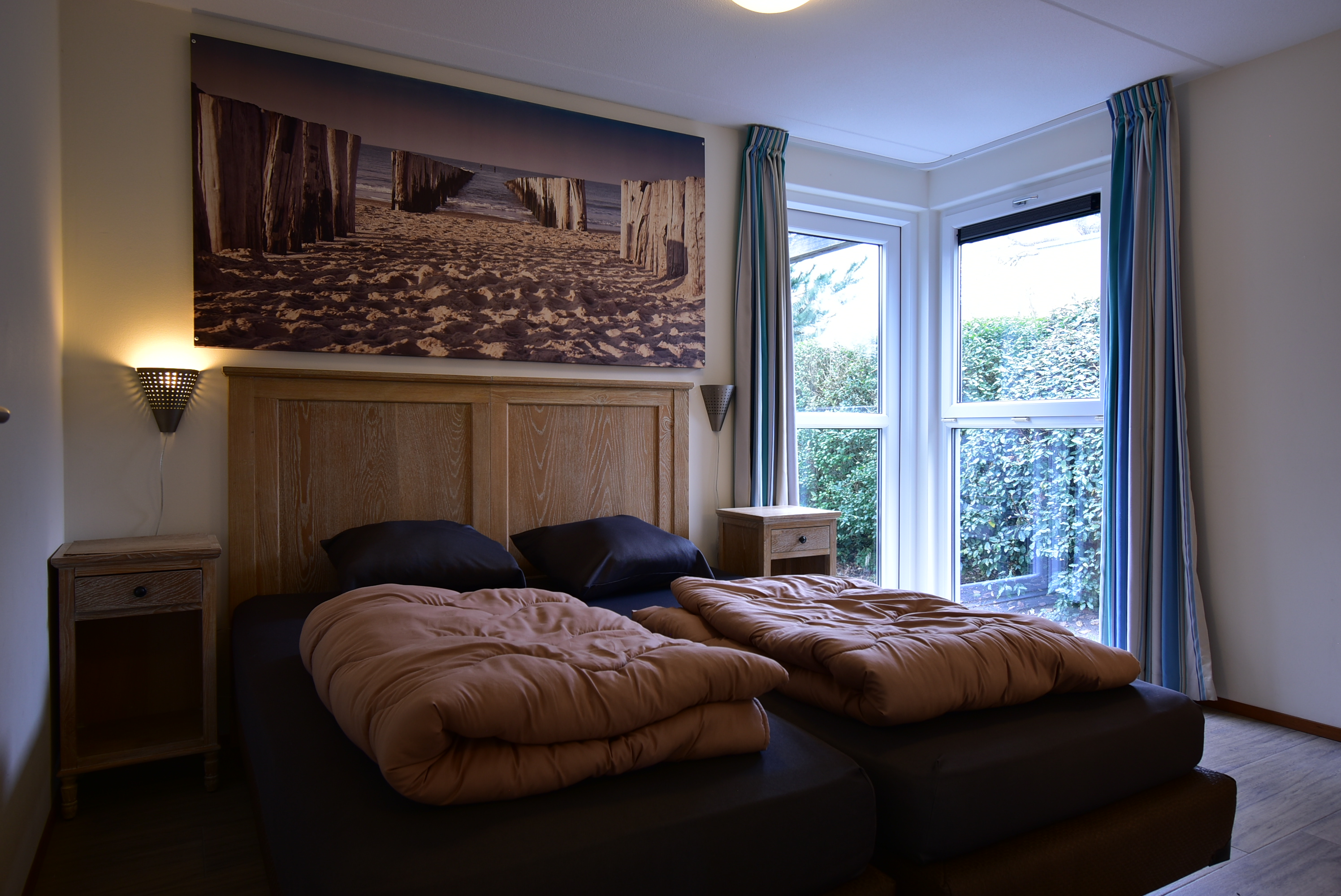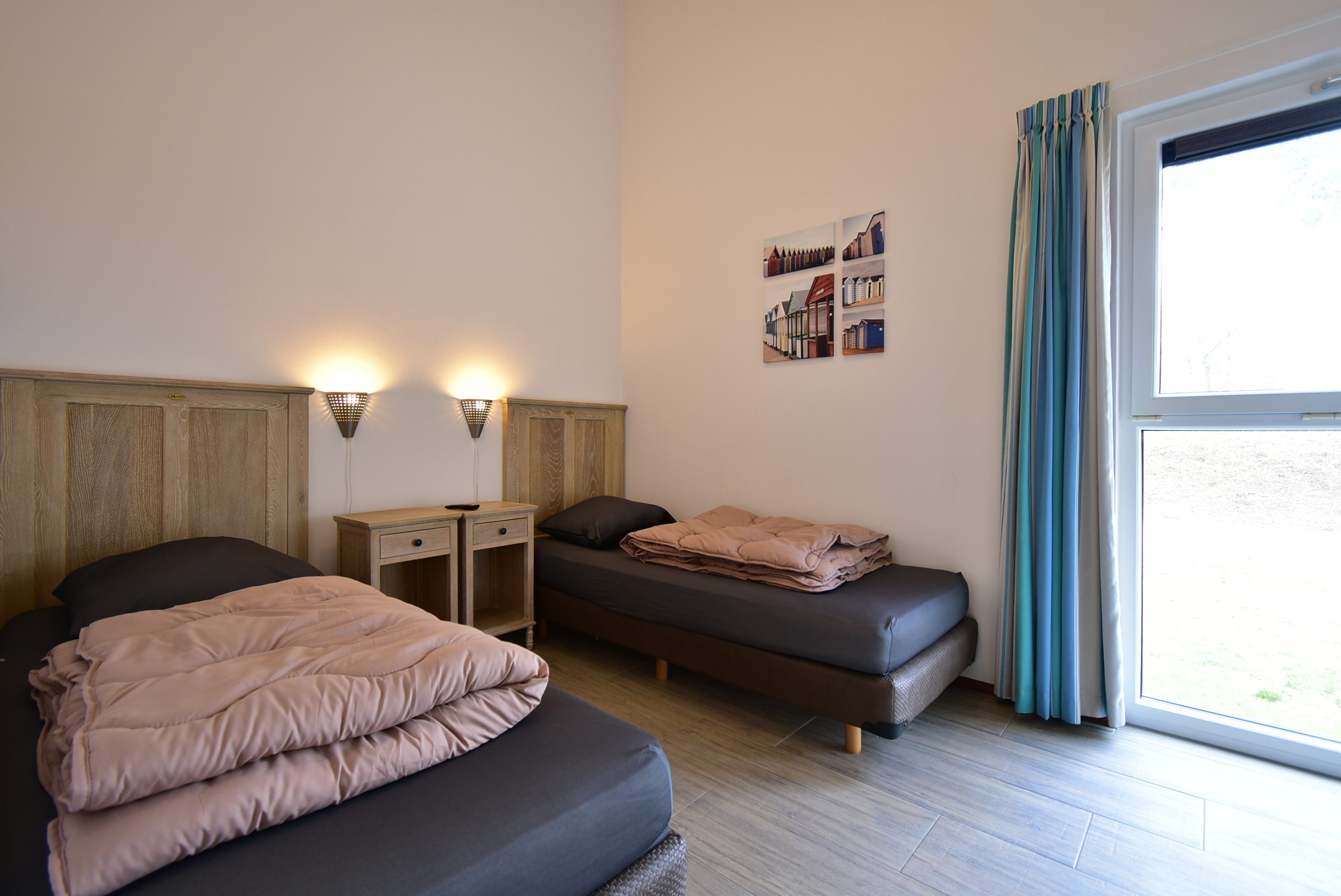 De tweede slaapkamer is een rustgevende ruimte die eveneens is ingericht in een lichte, natuurlijke stijl met een praktische houten vloer. De kamer beschikt over twee losse eenpersoonsbedden, elk voorzien van een robuust houten hoofdbord en sfeervolle, kegelvormige wandverlichting. Tussen de bedden in staan twee houten nachtkastjes met lades voor extra opbergruimte. Dankzij het grote raam met kamerhoge, blauw-wit gestreepte gordijnen valt er veel daglicht naar binnen. De kamer is daarnaast uitgerust met een eigen televisie aan de wand en een houten kledingkast, waardoor het aan geen enkel comfort ontbreekt.