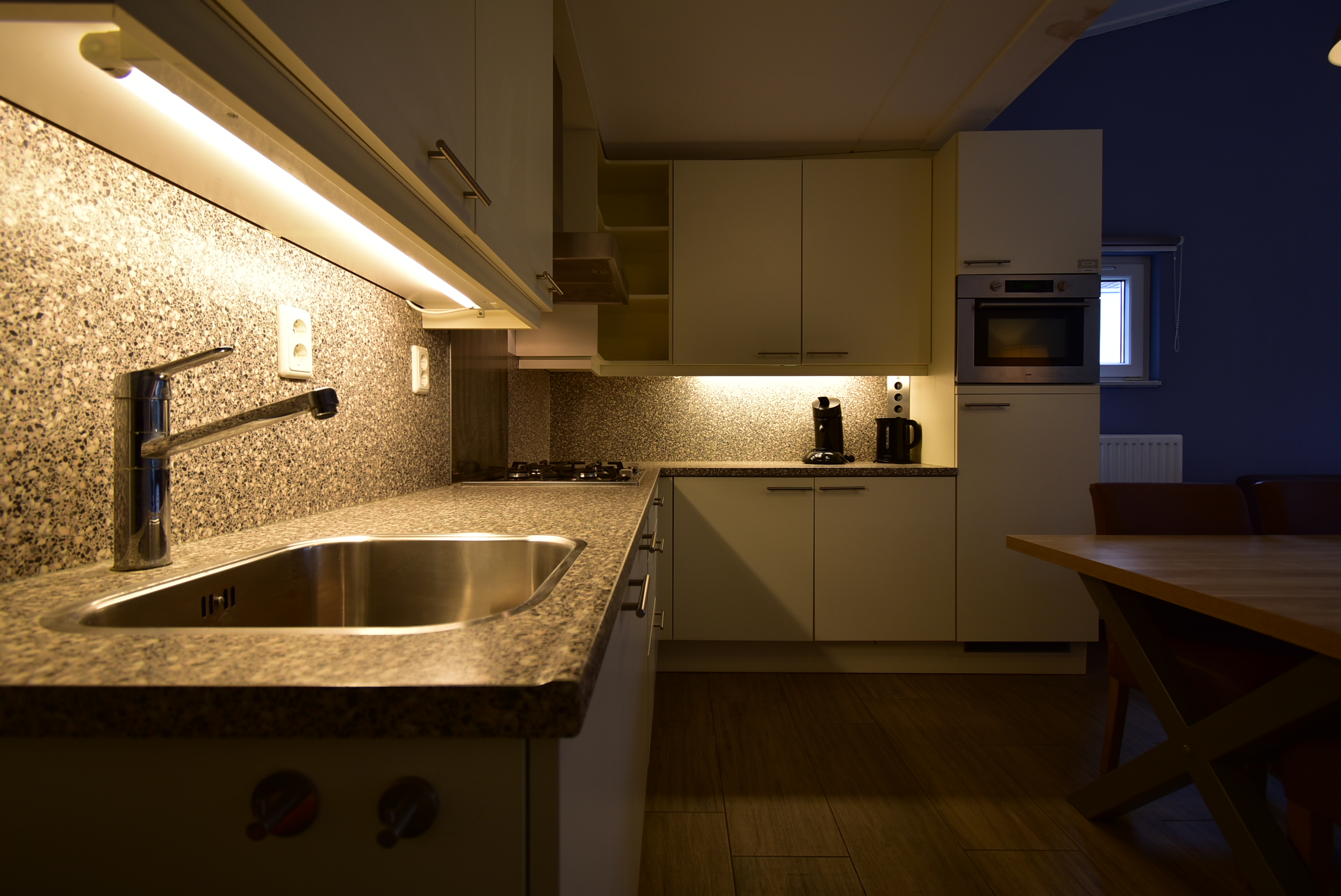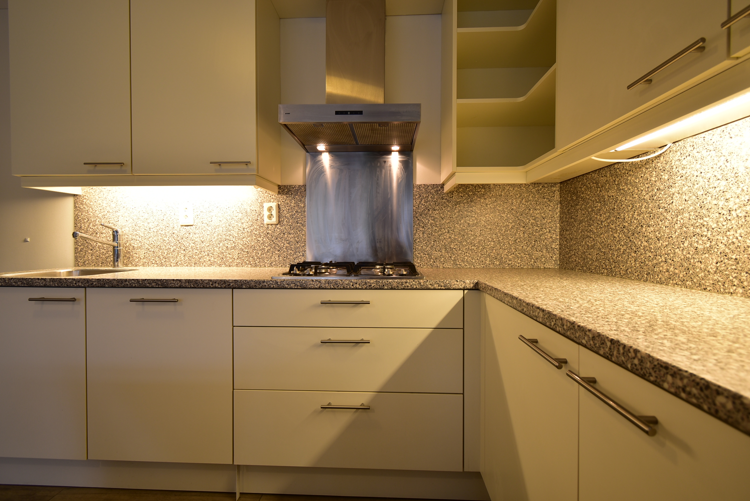 De moderne open keuken heeft een strakke, lichte uitstraling en is naadloos geïntegreerd met de rest van de leefruimte. De opstelling is voorzien van greeploze witte fronten en een donker, granietlook aanrechtblad dat voldoende werkruimte biedt. Voor optimaal kookgemak is de keuken compleet uitgerust met diverse inbouwapparatuur, waaronder een gaskookplaat met een achterwand, een afzuigkap, een vaatwasser en een combimagnetron die op ooghoogte is geplaatst. De achterwand is afgewerkt met een gespikkeld motief en wordt sfeervol verlicht door subtiele onderbouwverlichting onder de bovenkasten. Direct grenzend aan het kookgedeelte bevindt zich de eethoek, wat de keuken tot een sociaal en functioneel middelpunt van de woning maakt.