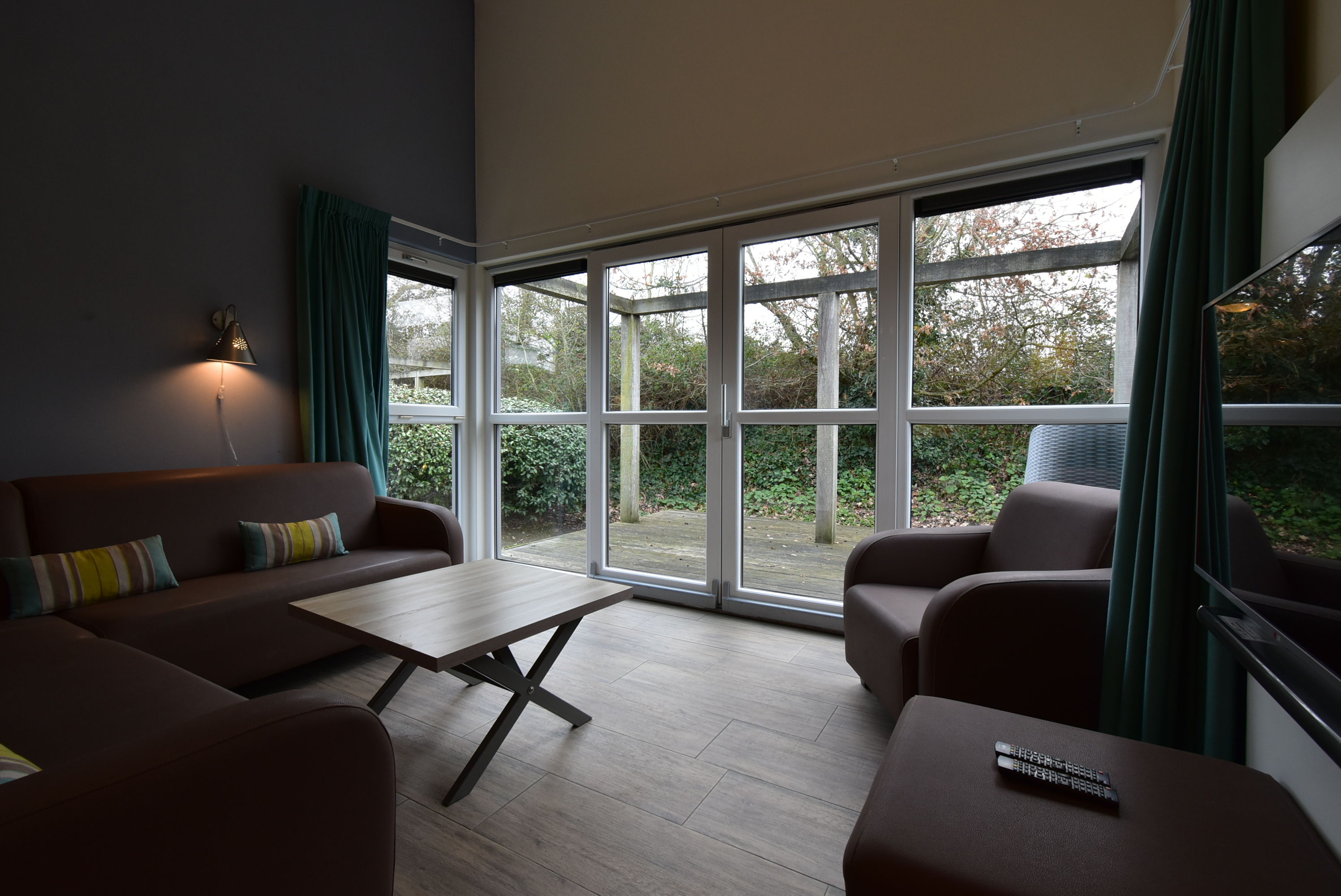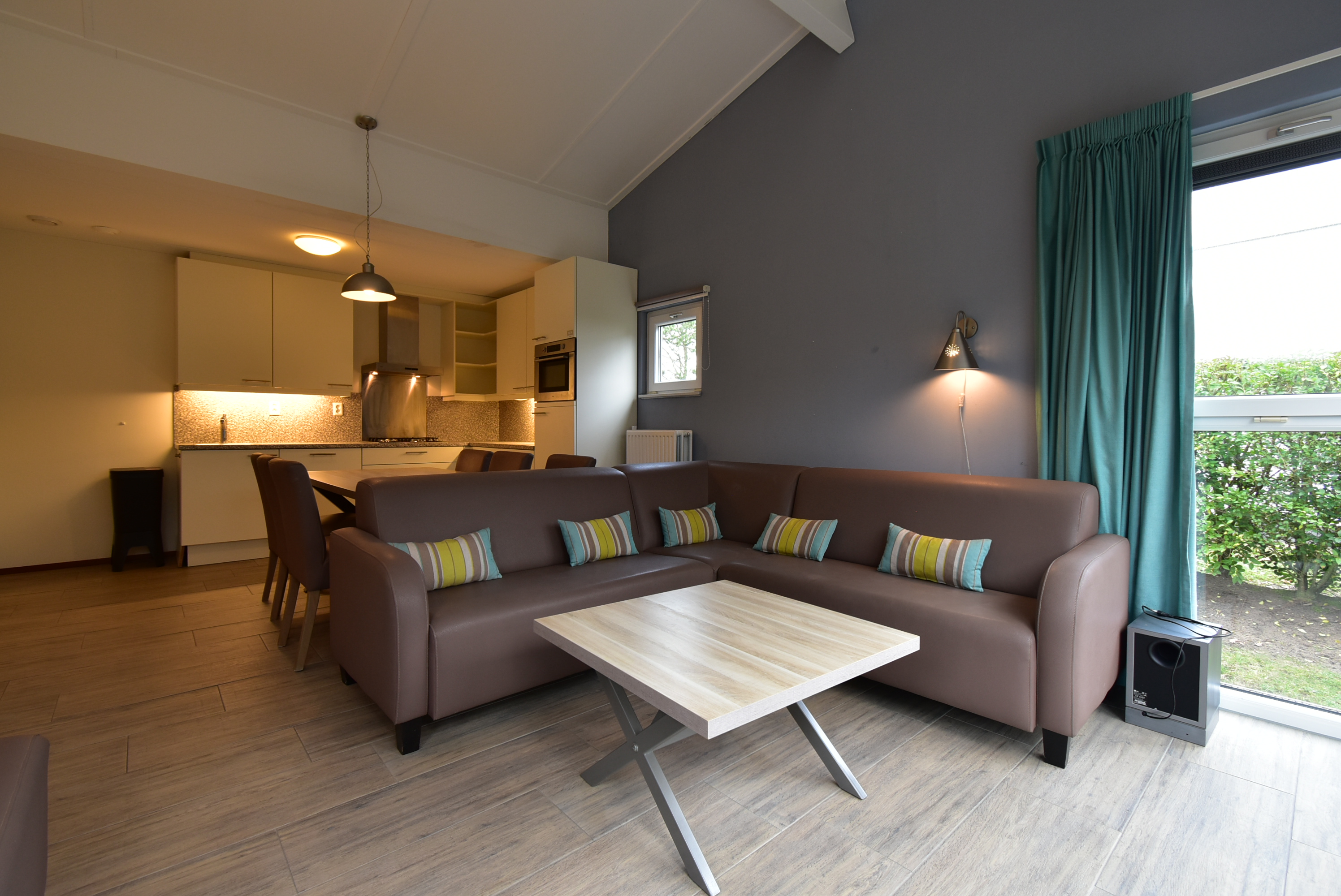 Dankzij de brede glazen pui met schuifdeur loopt de binnenruimte naadloos over in het aangrenzende houten vlonderterras. De zithoek is comfortabel ingericht met een royale hoekbank, een bijpassende fauteuil en een moderne salontafel met een licht houten blad. De vloer heeft een warme houtuitstraling, die door de aanwezige vloerverwarming ook in de koudere maanden zeer comfortabel aanvoelt. Omdat de woonkamer direct in verbinding staat met de moderne open keuken, vormt het een gezellige en centrale plek in de recreatiewoning.