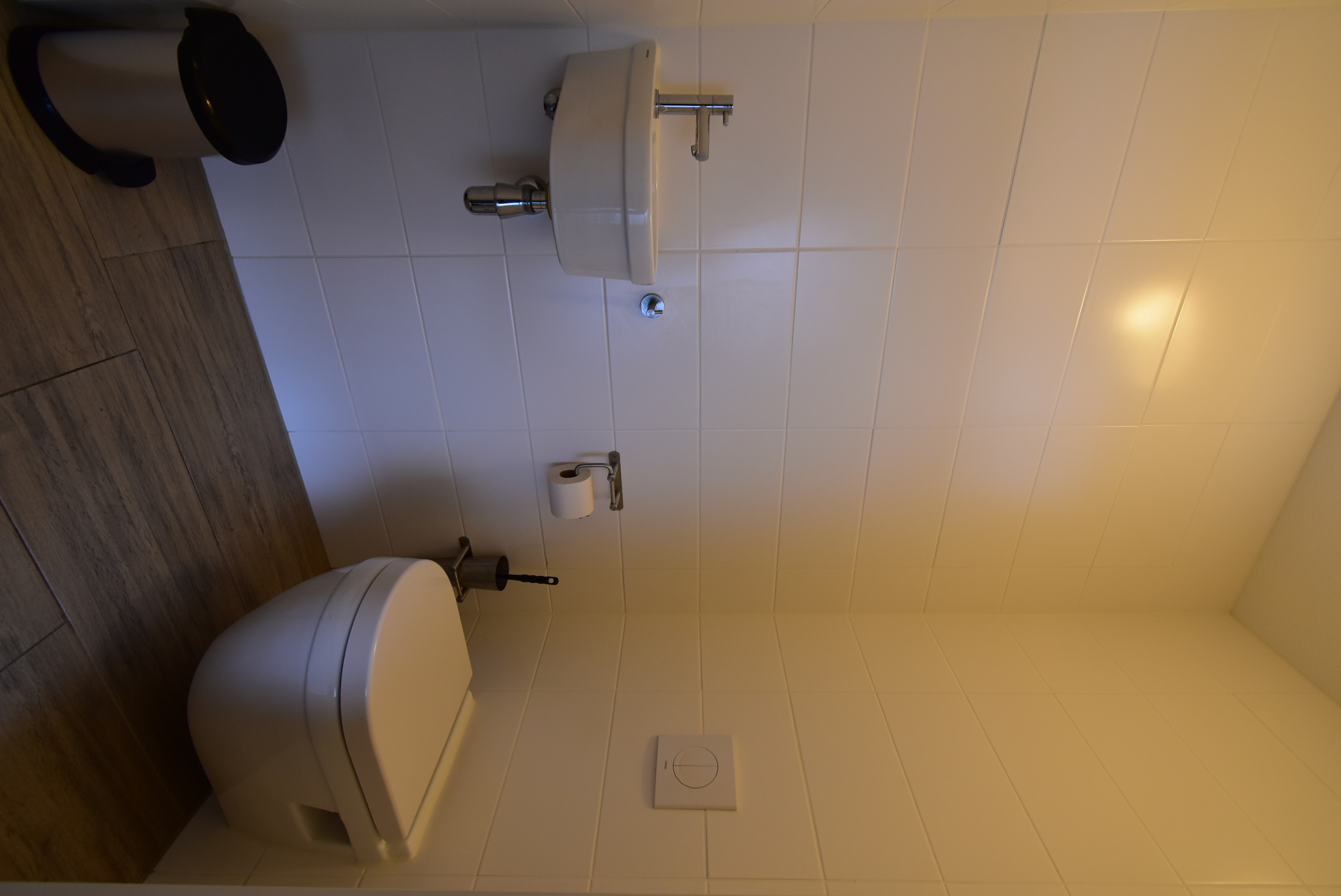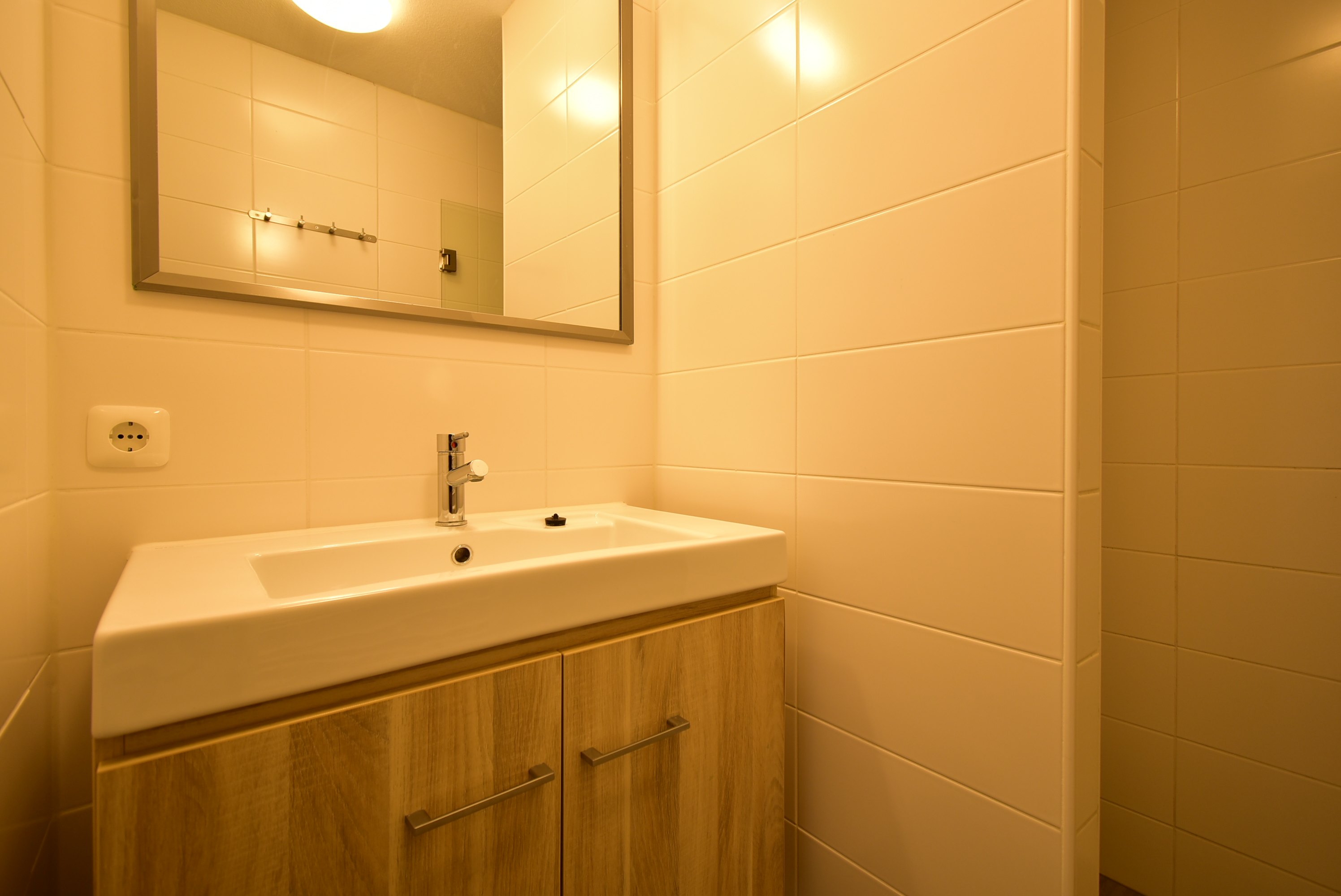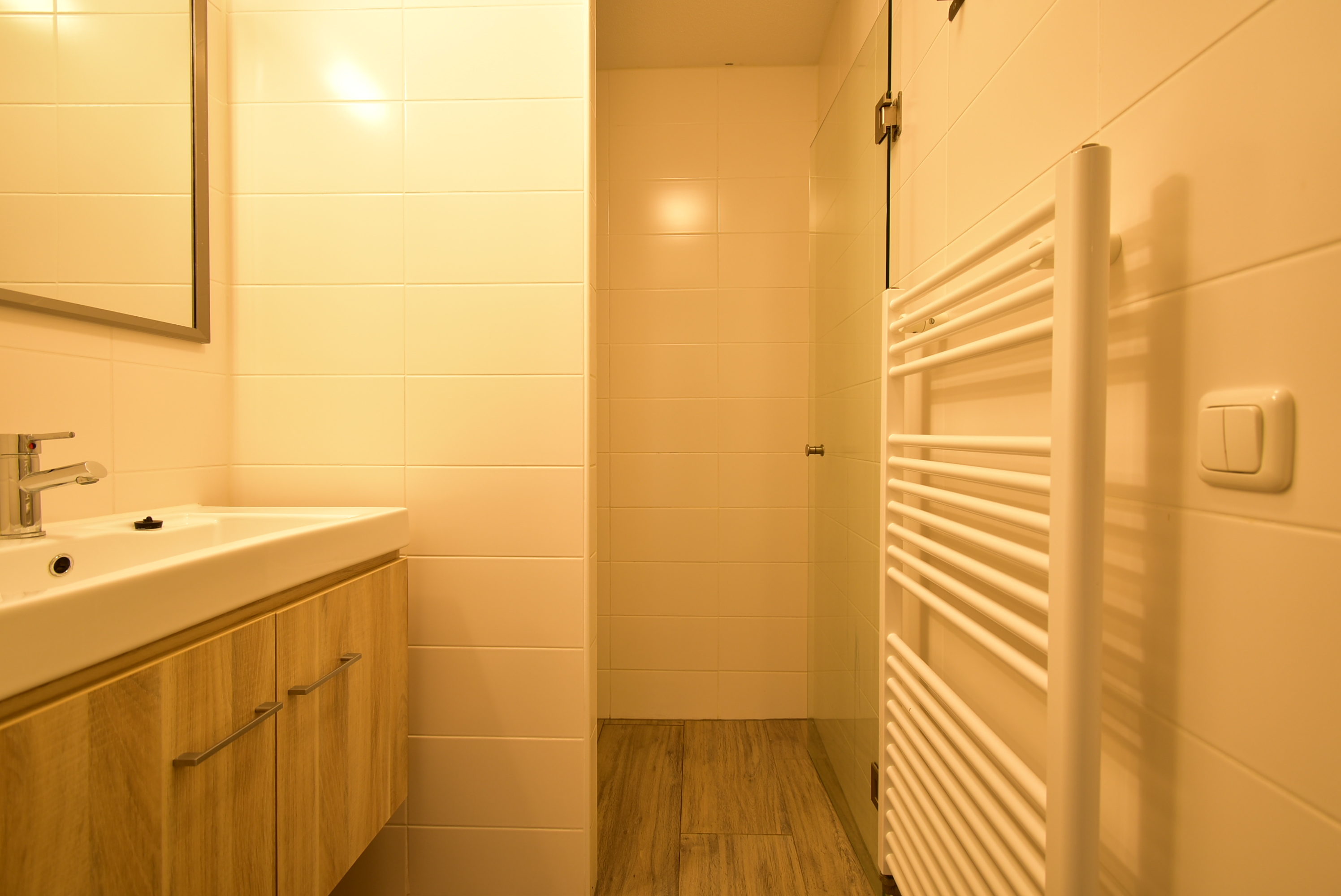 De tweede badkamer is eveneens modern en strak afgewerkt met witte wandtegels en een praktische vloer met houtlook. Deze ruimte beschikt over een comfortabele inloopdouche die wordt afgescheiden door een glazen wand. Voor het gemak is er een wit wastafelmeubel met een houtlook onderkast geplaatst, waarboven een grote spiegel hangt. De badkamer wordt aangenaam warm gehouden door een witte verticale designradiator, die tevens ideaal is voor het drogen van handdoeken.