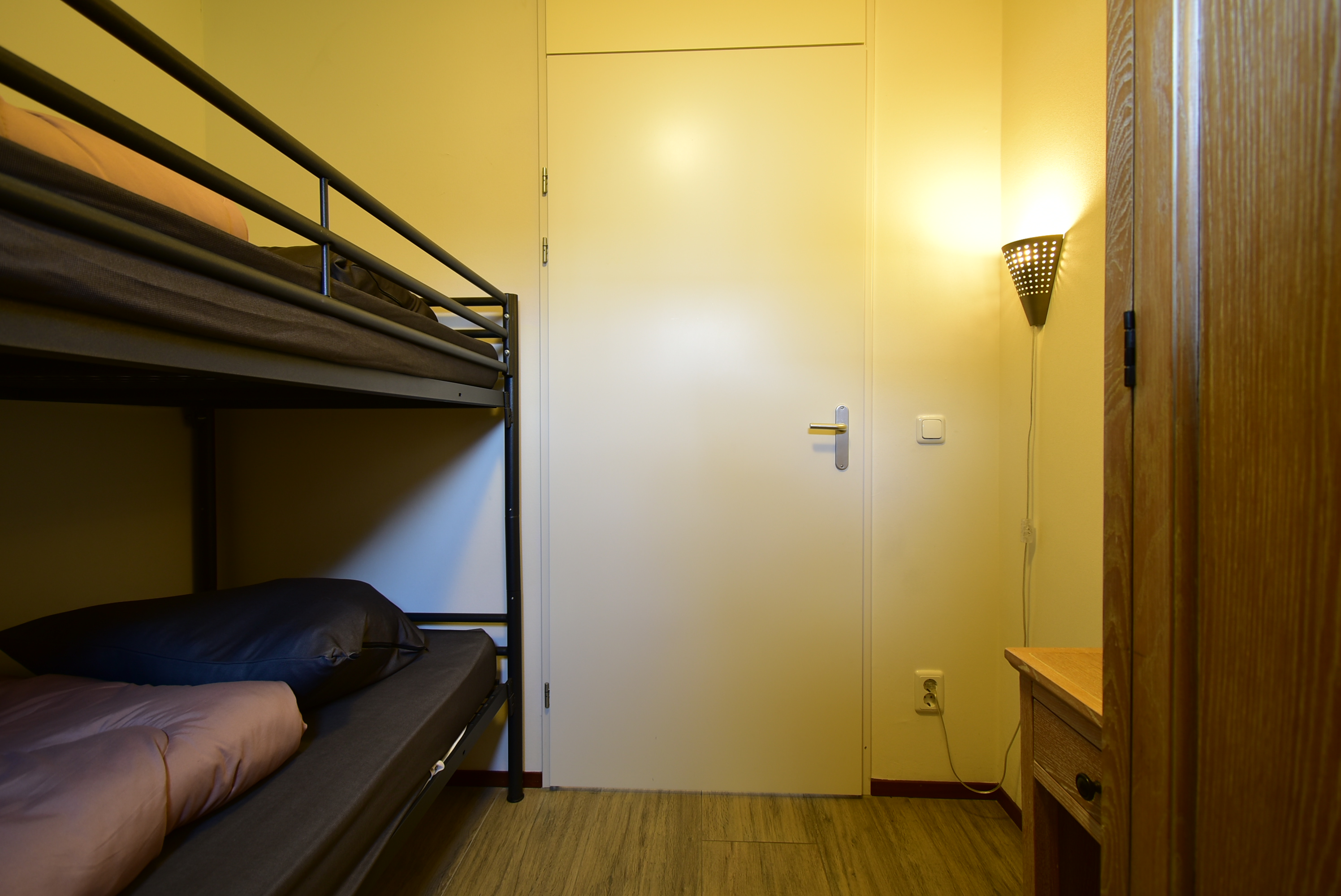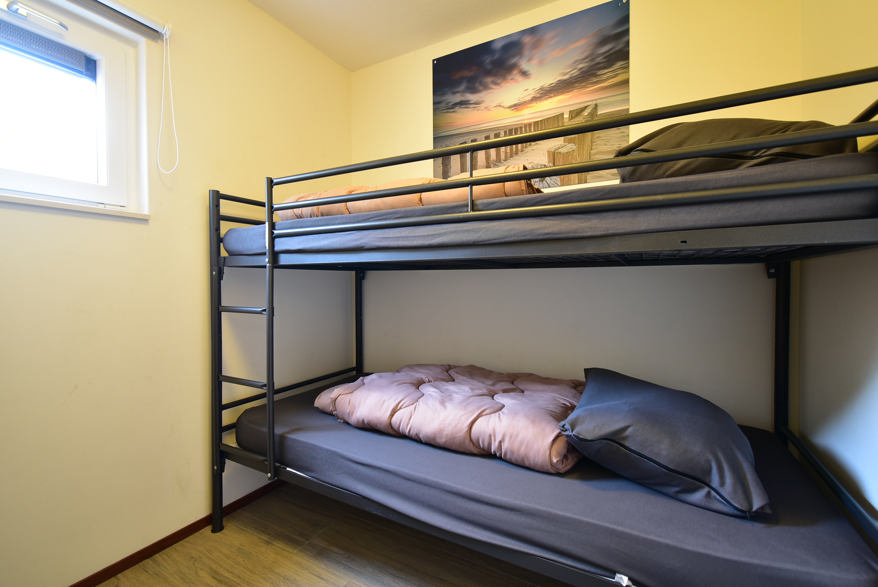 De derde en laatste slaapkamer is een compacte maar efficiënt ingerichte ruimte, ideaal voor kinderen of extra gasten. De kamer is voorzien van een stevig metalen stapelbed met donkergrijze matrassen en warme, roze-bruine dekbedden. Ook hier komt het kustthema terug door een grote, sfeervolle wanddecoratie van een zonsondergang aan het strand boven het bed. De kamer geniet van natuurlijk licht door een hooggeplaatst raam dat is afgewerkt met een rolgordijn. Voor extra comfort en gemak is de ruimte uitgerust met een houten nachtkastje, een subtiele wandlamp en een praktische houten kledingkast voor het opbergen van vakantiebagage.