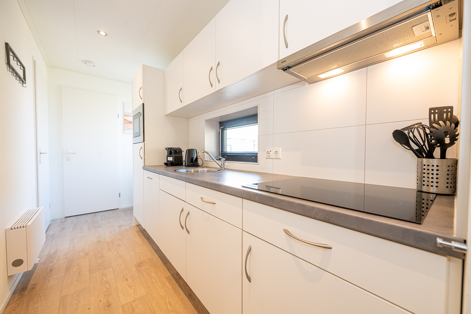 De open keuken is modern uitgevoerd en voorzien van de benodigde inbouwapparatuur.