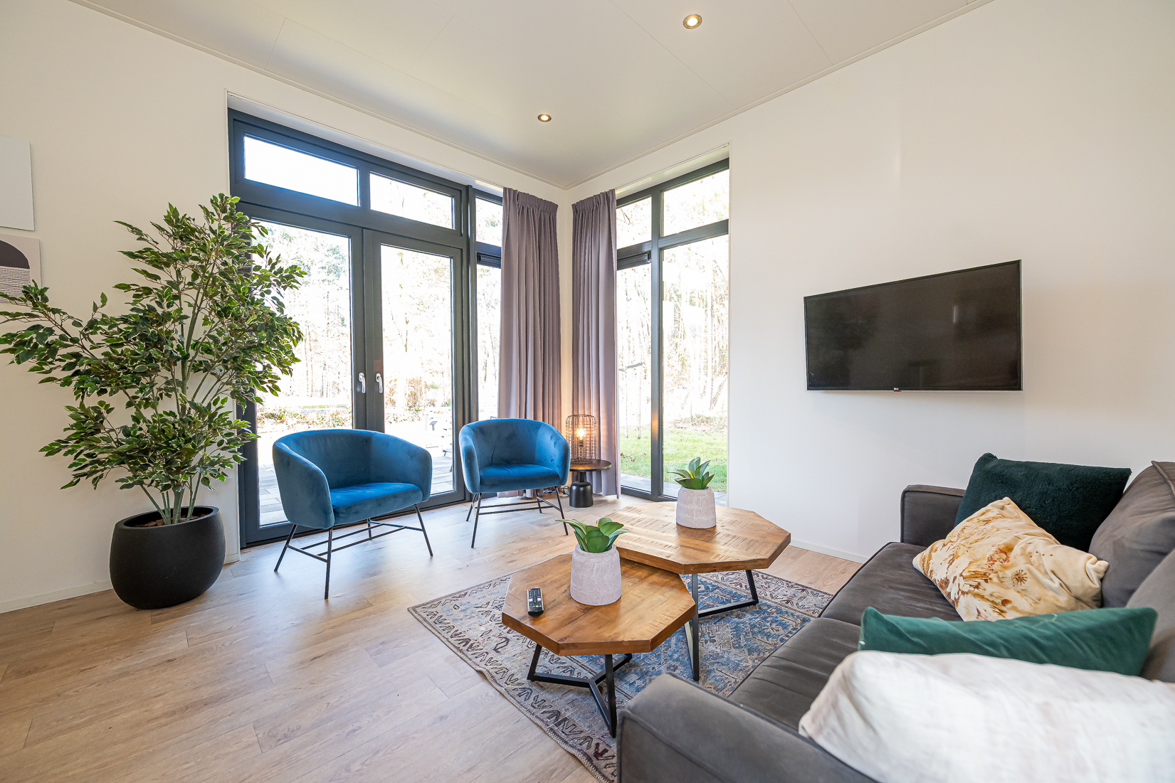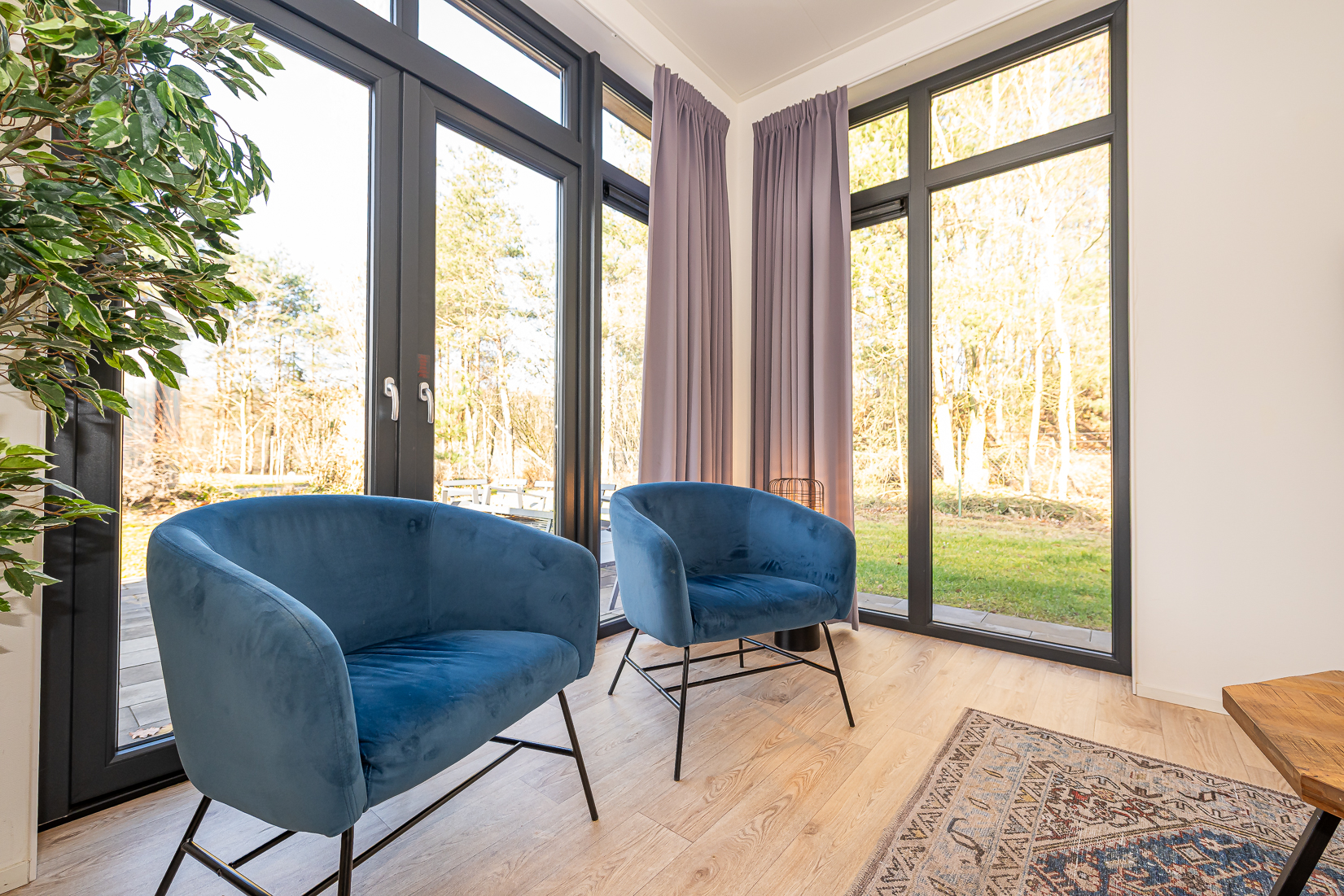 De living is praktisch ingedeeld en voelt licht en open aan dankzij de grote raampartijen en de moderne afwerking. Vanuit de woonkamer kijkt u uit op de tuin en het aangrenzende bos, wat bijdraagt aan het rustige karakter van de woning. Er is ruimte voor een comfortabele zithoek en een eethoek. De open keuken is modern uitgevoerd en voorzien van de benodigde inbouwapparatuur. De aanwezige airconditioning verhoogt het wooncomfort aanzienlijk.