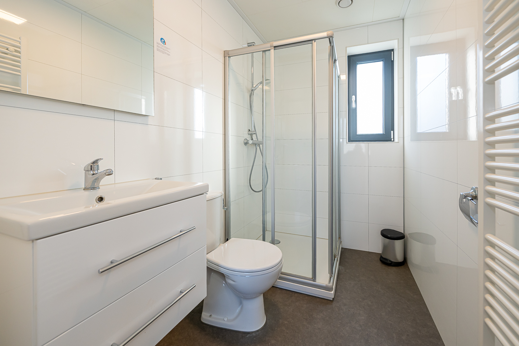 De badkamer is modern uitgevoerd en voorzien van een douche en wastafel, uitgevoerd in een neutrale en tijdloze stijl die past bij het moderne karakter van de woning.