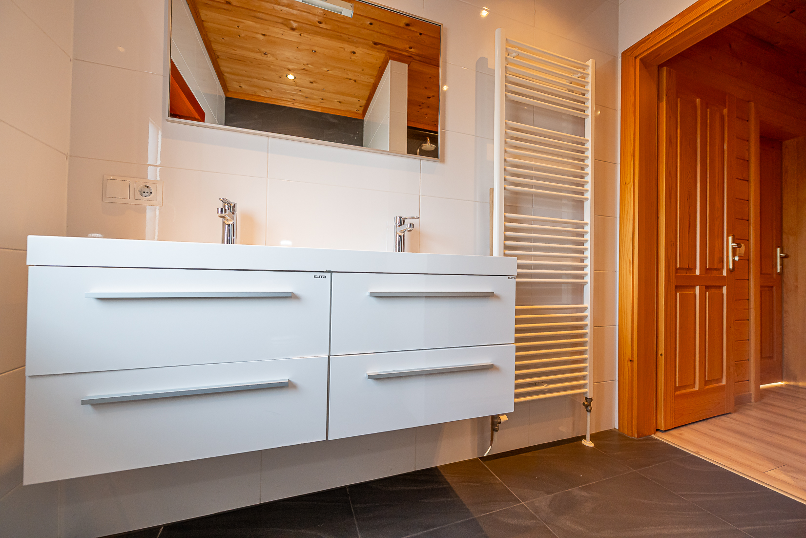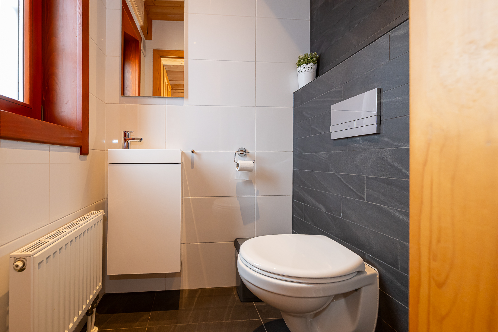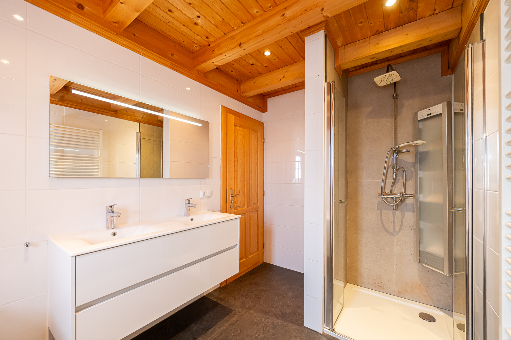 De badkamers zijn modern afgewerkt en praktisch ingedeeld. Een van de ruimtes is omgebouwd tot een afgesloten wellnessvoorziening met een hoogwaardige sauna. Daarnaast is er een afgesloten ruimte waar een wasmachine en droger staan wat de woning zeer geschikt maakt voor langere verblijven en verhuur.