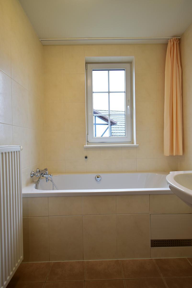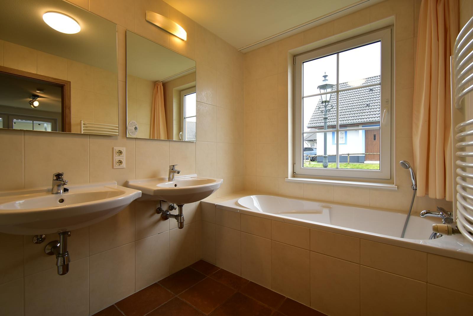 Badkamer met ligbad en wastafel(s), met daglicht via het raam. Ideaal als extra badkamer voor het gezelschap, zodat iedereen de ruimte heeft.