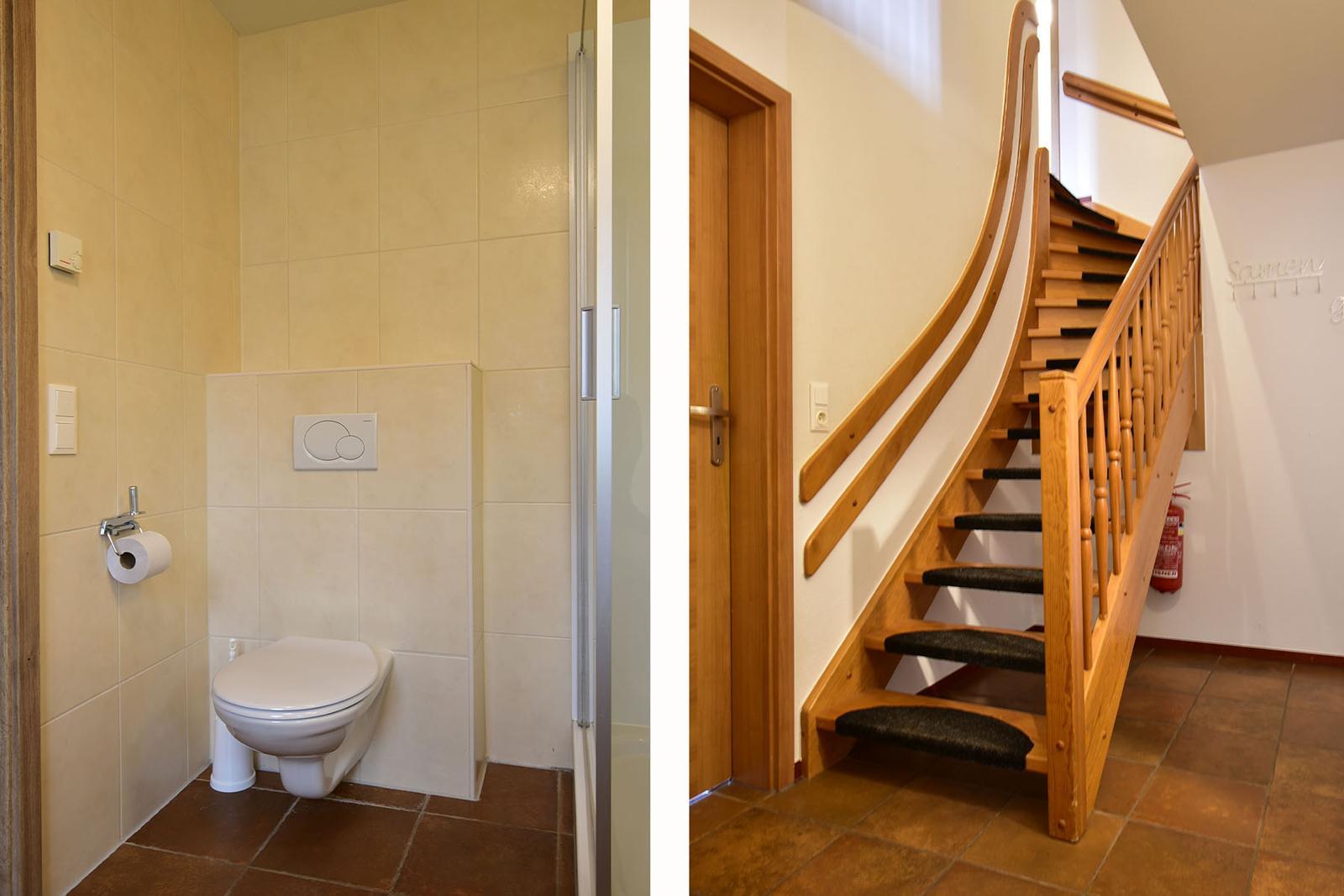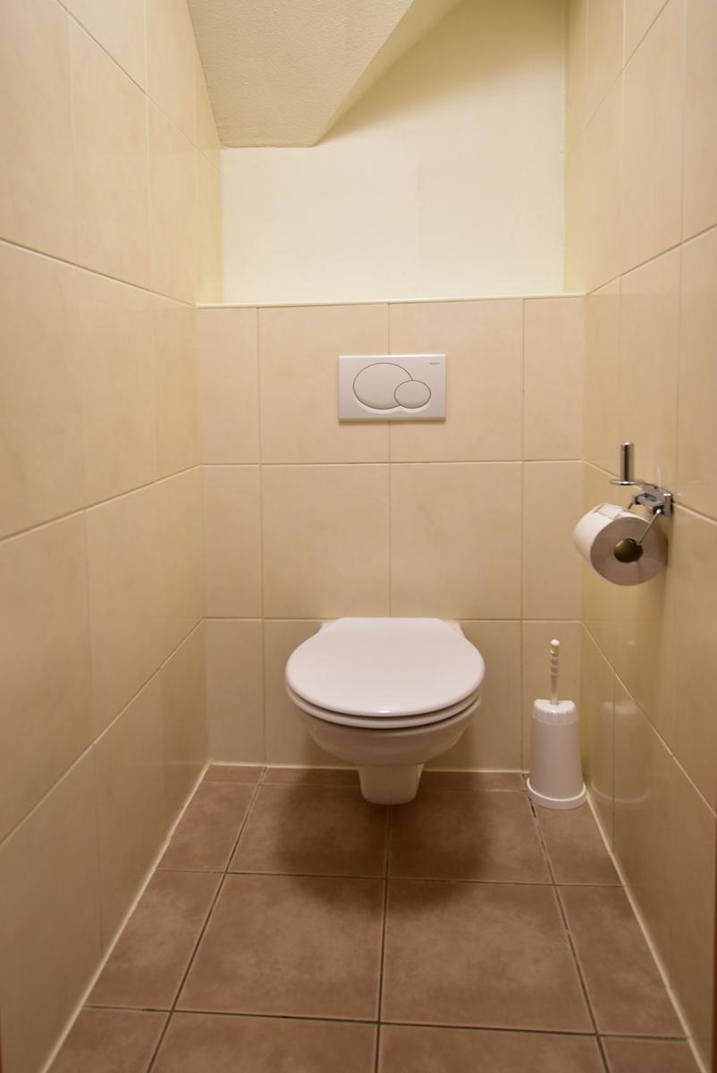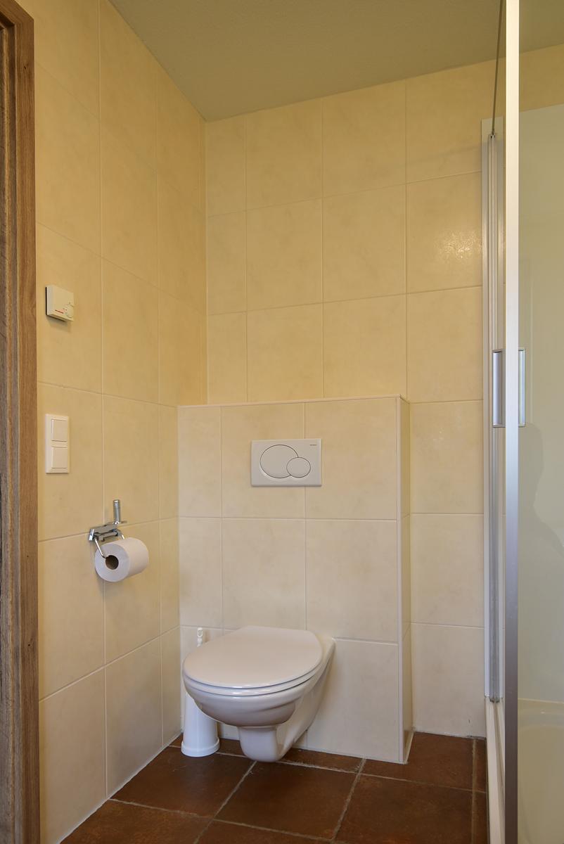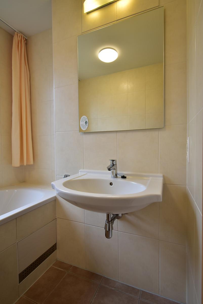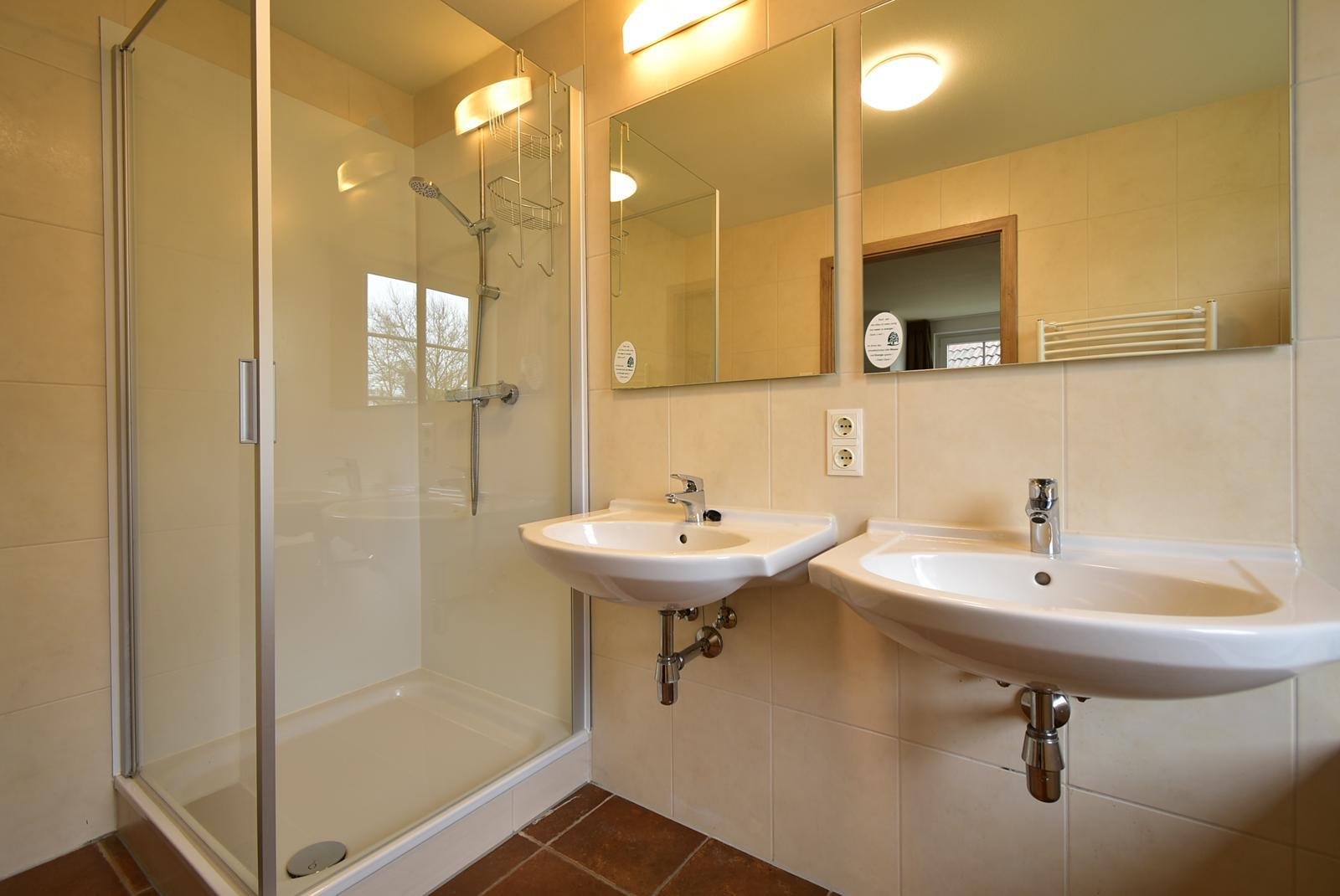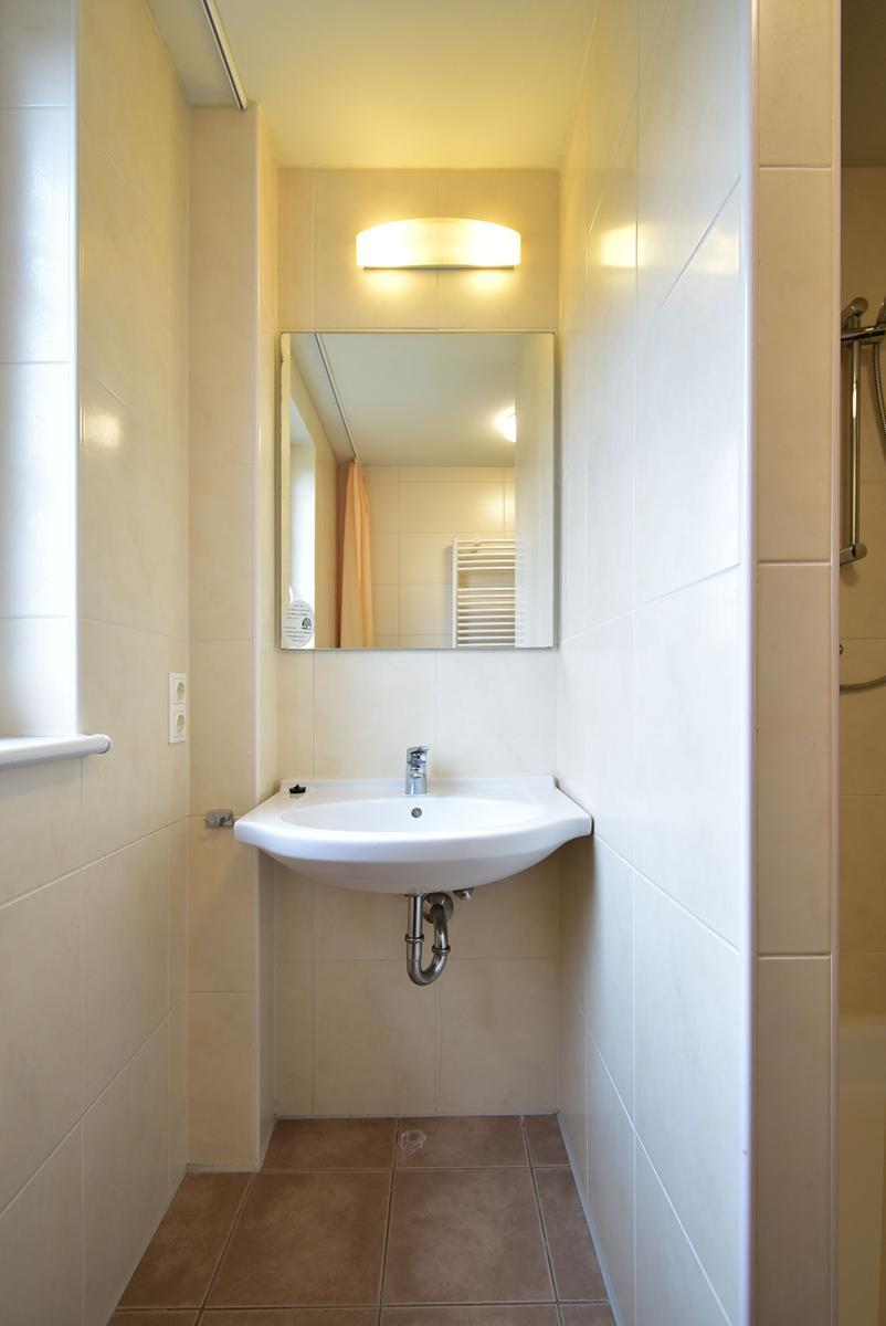Badkamer met wastafel en douche, zonder toilet. Handig als extra doucheruimte, zodat de ochtendspits met 12 personen soepel verloopt.
