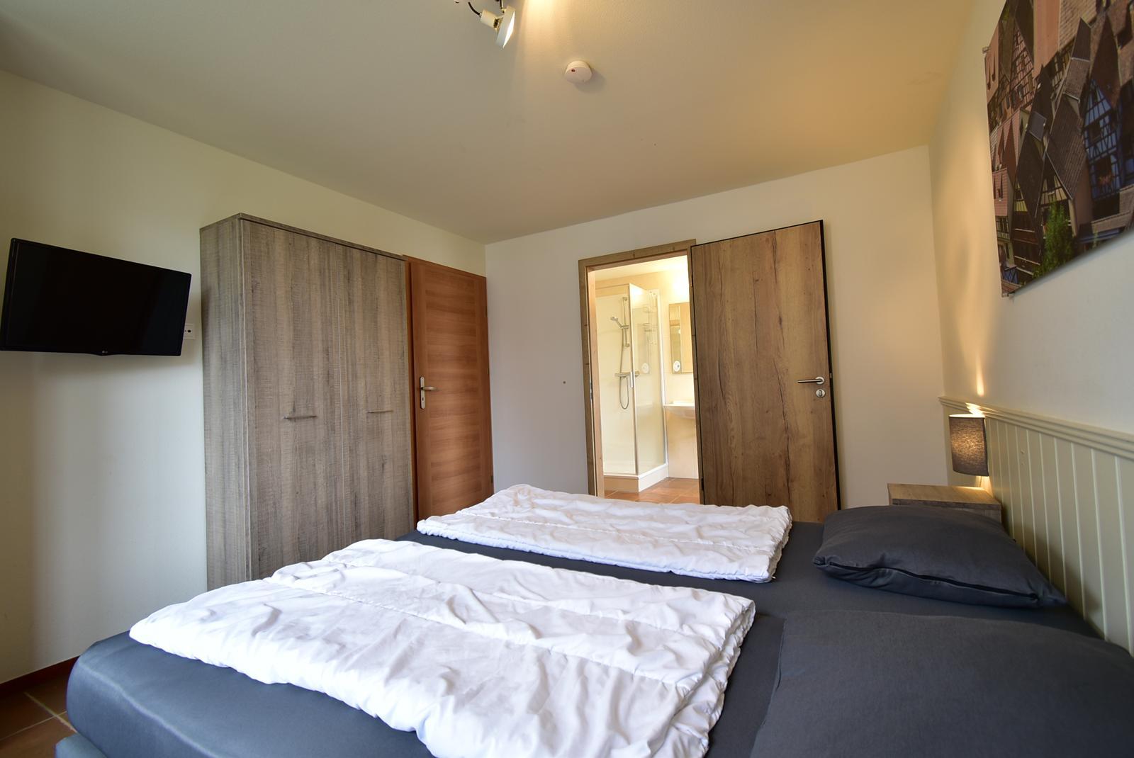 Slaapkamer op de begane grond met twee 1-persoonsbedden en directe toegang tot een eigen badkamer. Praktisch voor wie gelijkvloers wil slapen en ideaal voor gasten die extra privacy waarderen.