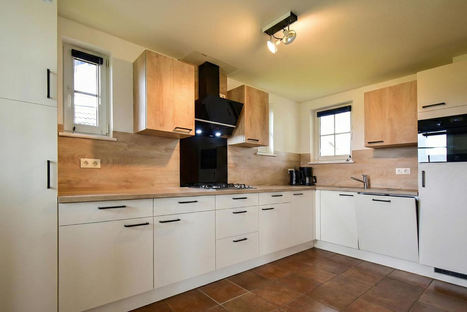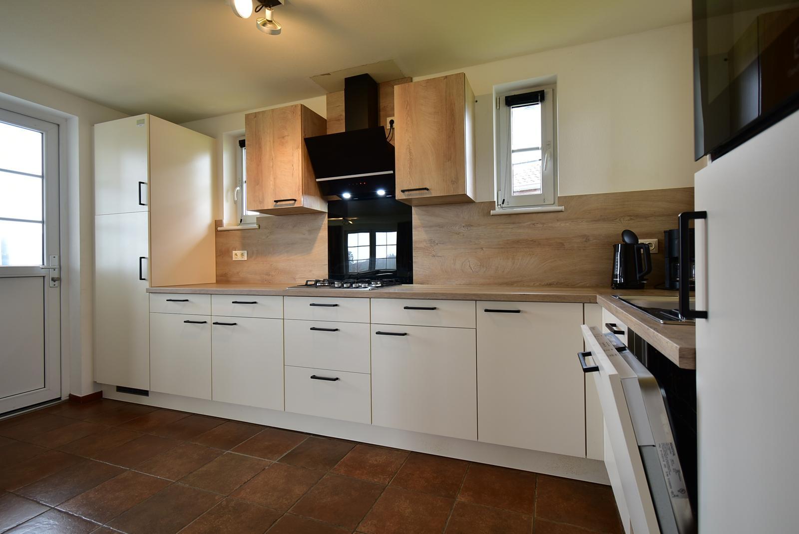 Recent vernieuwde keuken met veel werk- en kastruimte. Strakke opstelling in wit met houtaccenten en moderne afwerking. Voorzien van onder andere een vaatwasser, combimagnetron en een koelkast met vriesvak. Dankzij de ramen en de deur naar buiten is het een prettige, lichte ruimte om samen te koken.