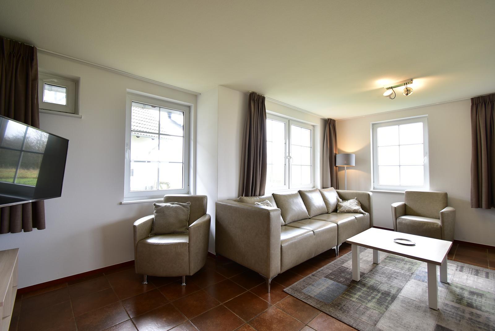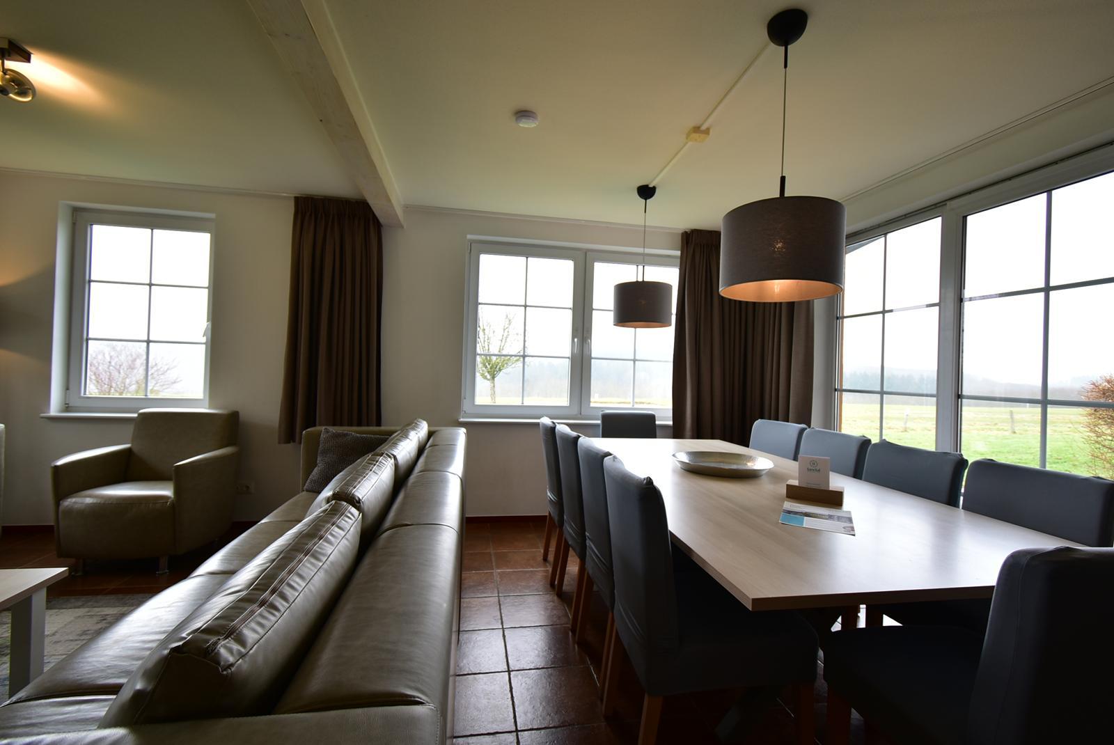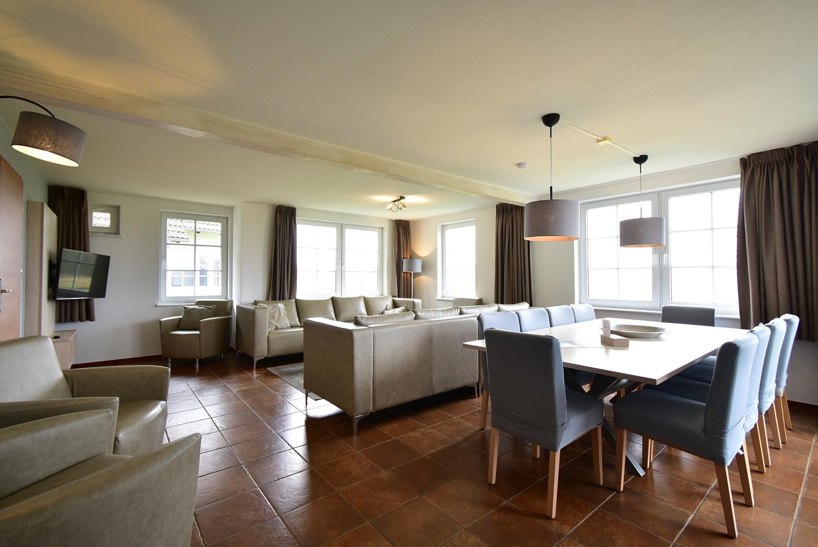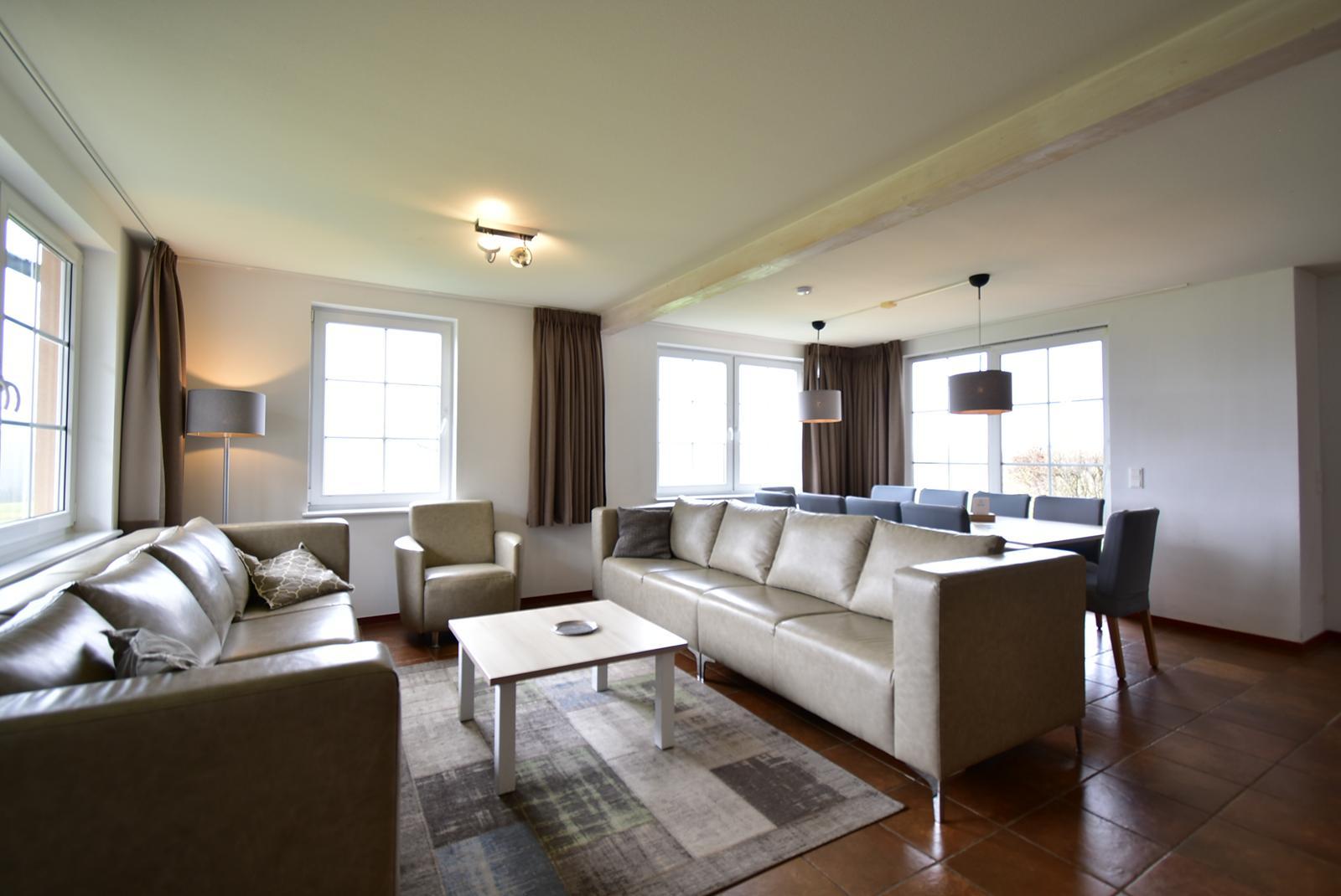 Ruime en lichte woonkamer met meerdere ramen rondom en een open verbinding met de grote eethoek. De zithoek is comfortabel ingericht en biedt volop plek voor het hele gezelschap. De praktische vloerafwerking maakt de ruimte onderhoudsvriendelijk, terwijl de neutrale styling zorgt voor een rustige, instapklare uitstraling