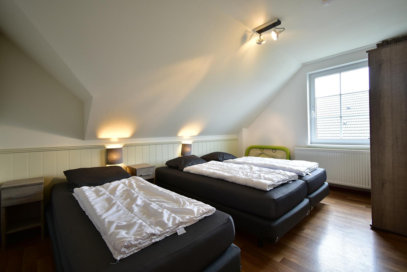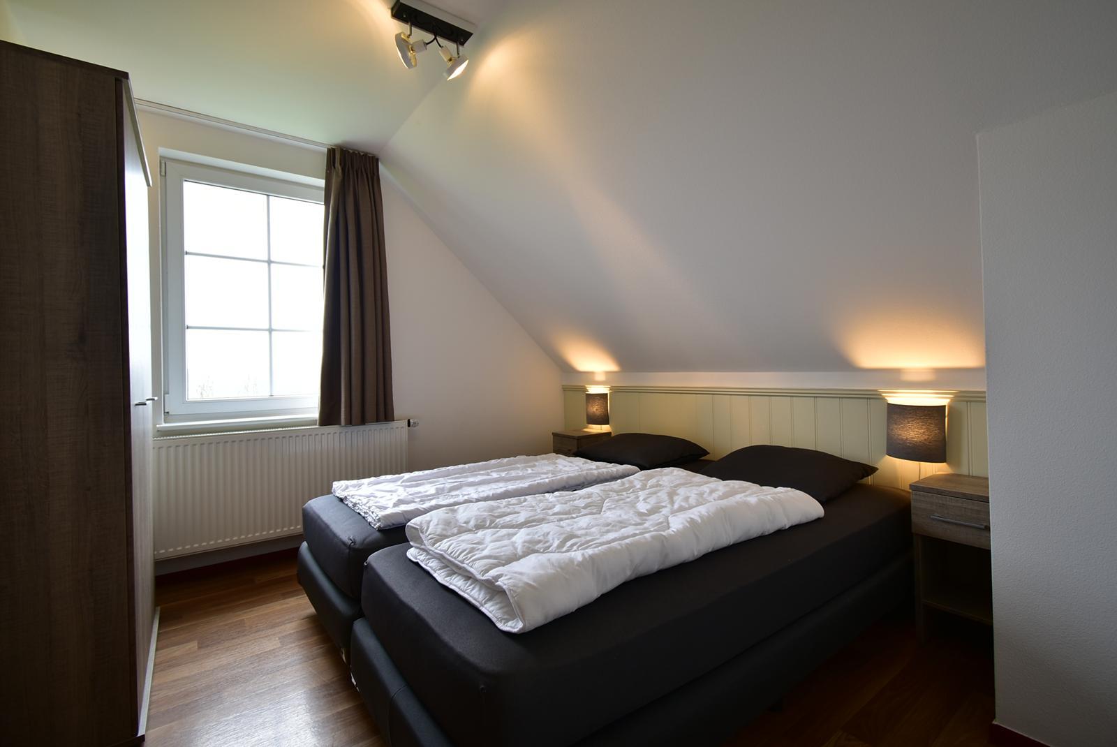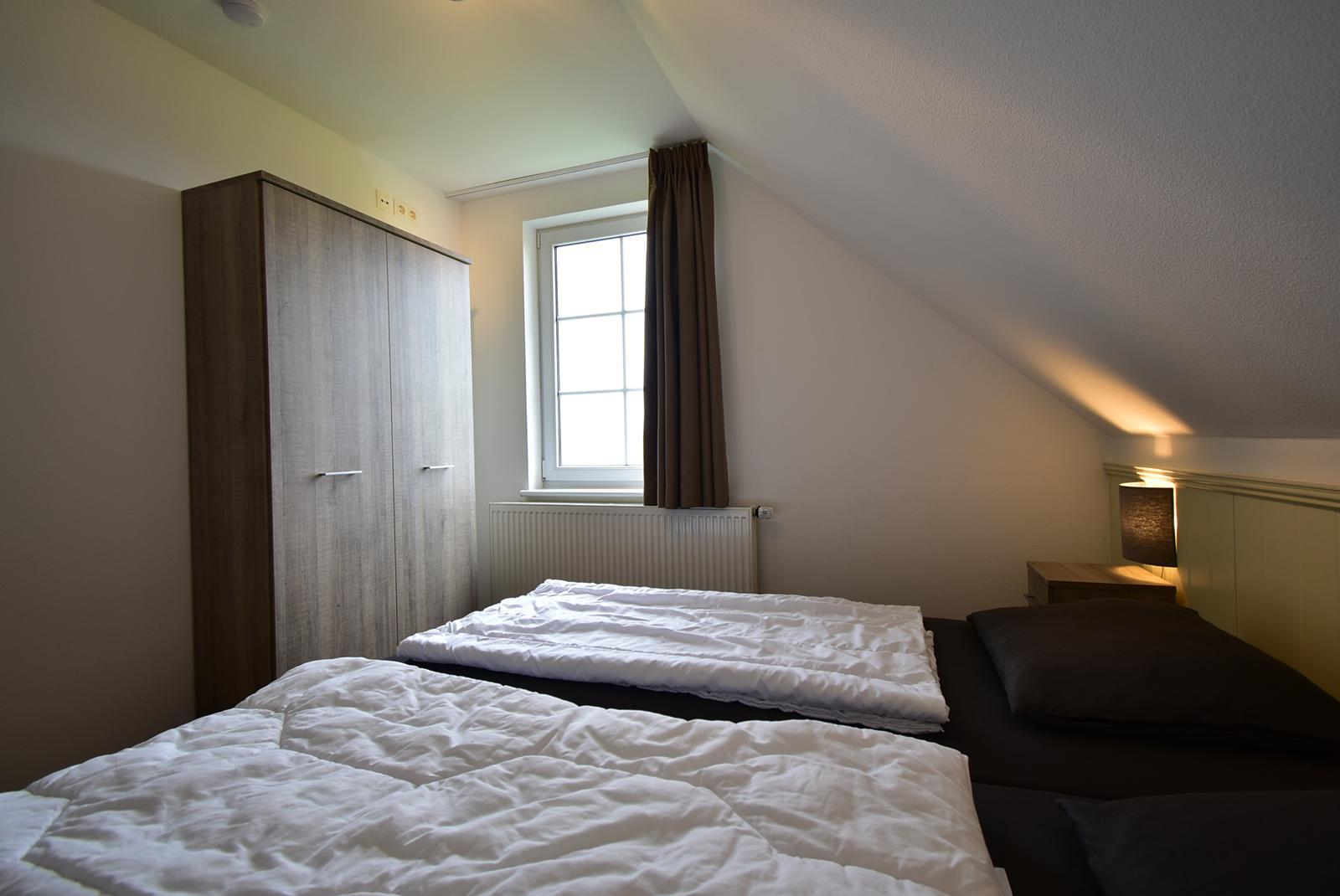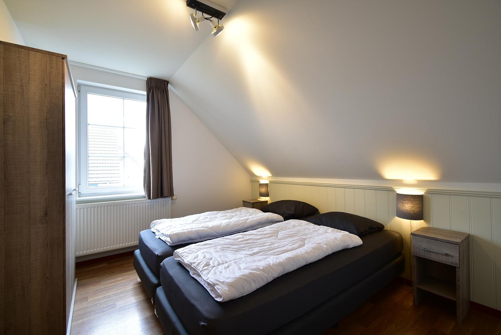 Slaapkamer met twee 1-persoonsbedden en een nette, instapklare uitstraling. Prettig als rustige slaapruimte, met voldoende daglicht en kastruimte.