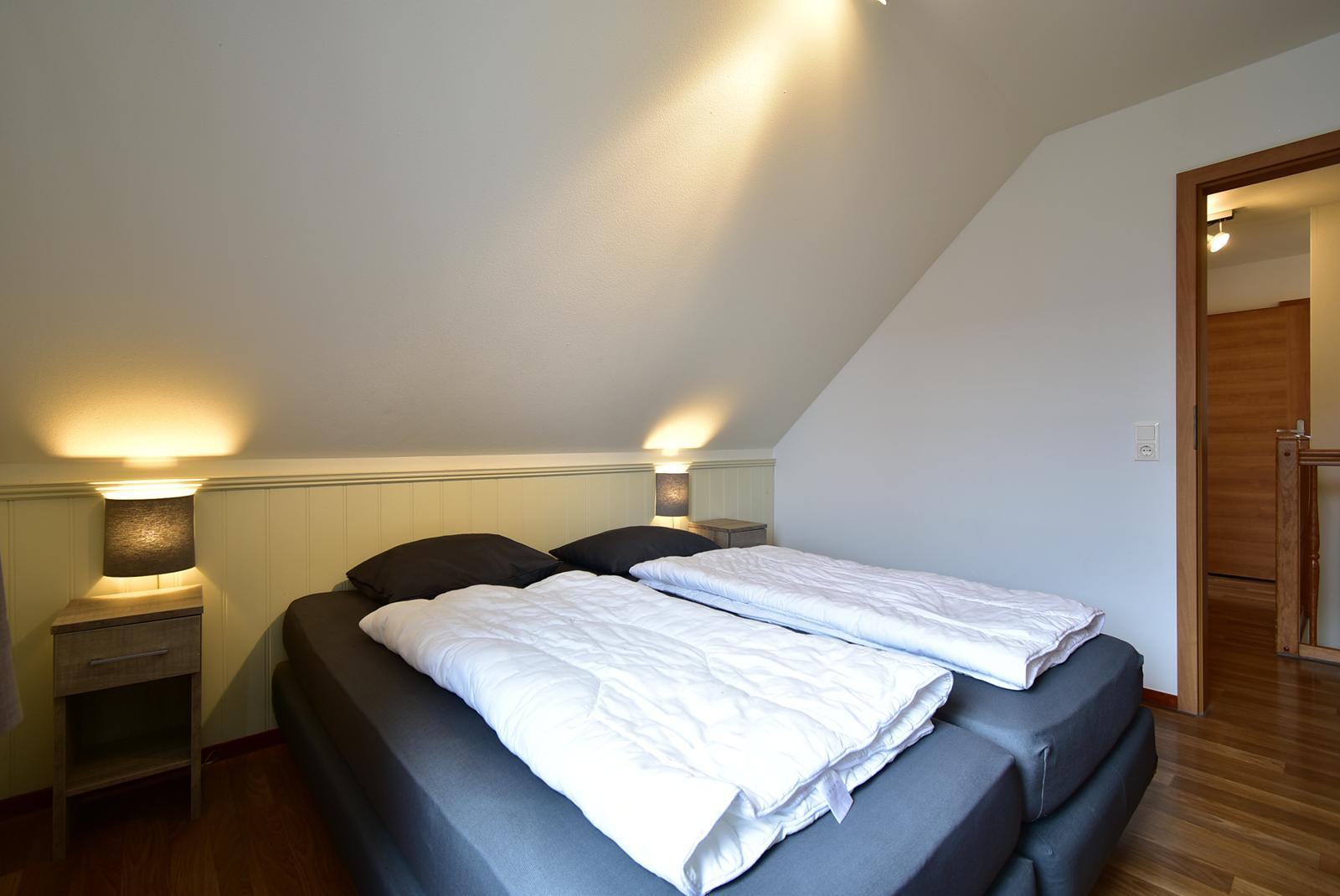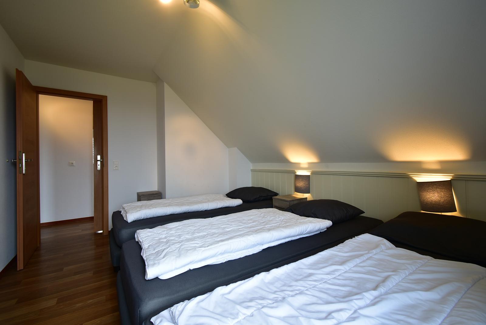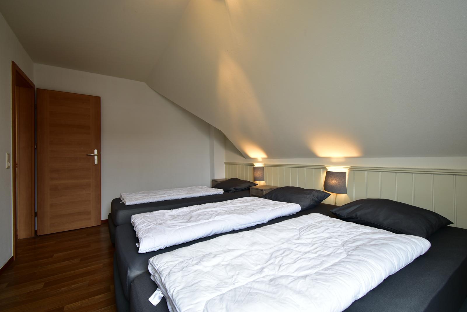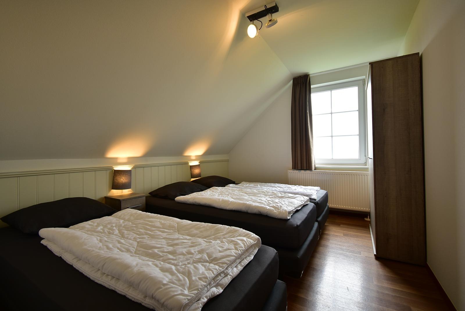 Tweede 3-persoons slaapkamer met drie 1-persoonsbedden. Handig voor families of vriendengroepen die samen willen slapen, zonder in te leveren op comfort.