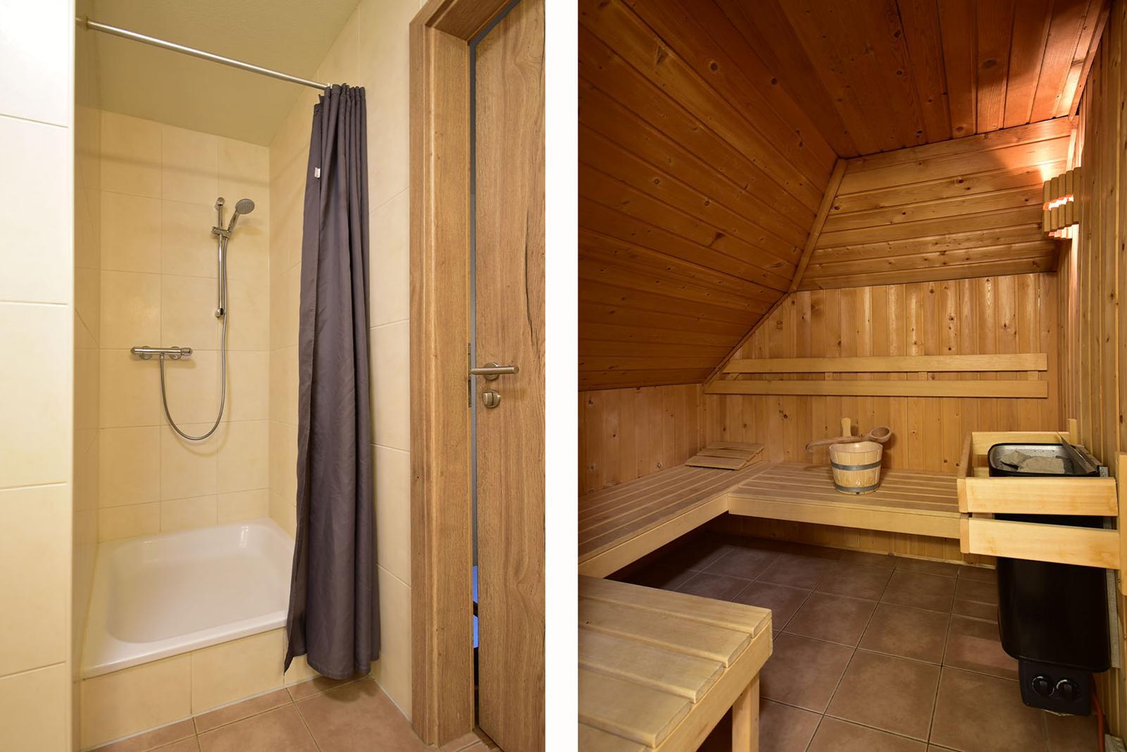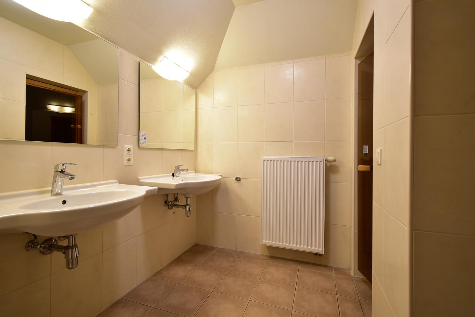 Badkamer met dubbele wastafel en wellness: een Finse sauna op dezelfde verdieping. Een fijne extra voor ontspanning na een actieve dag, en een duidelijke meerwaarde voor verhuur en eigen gebruik.