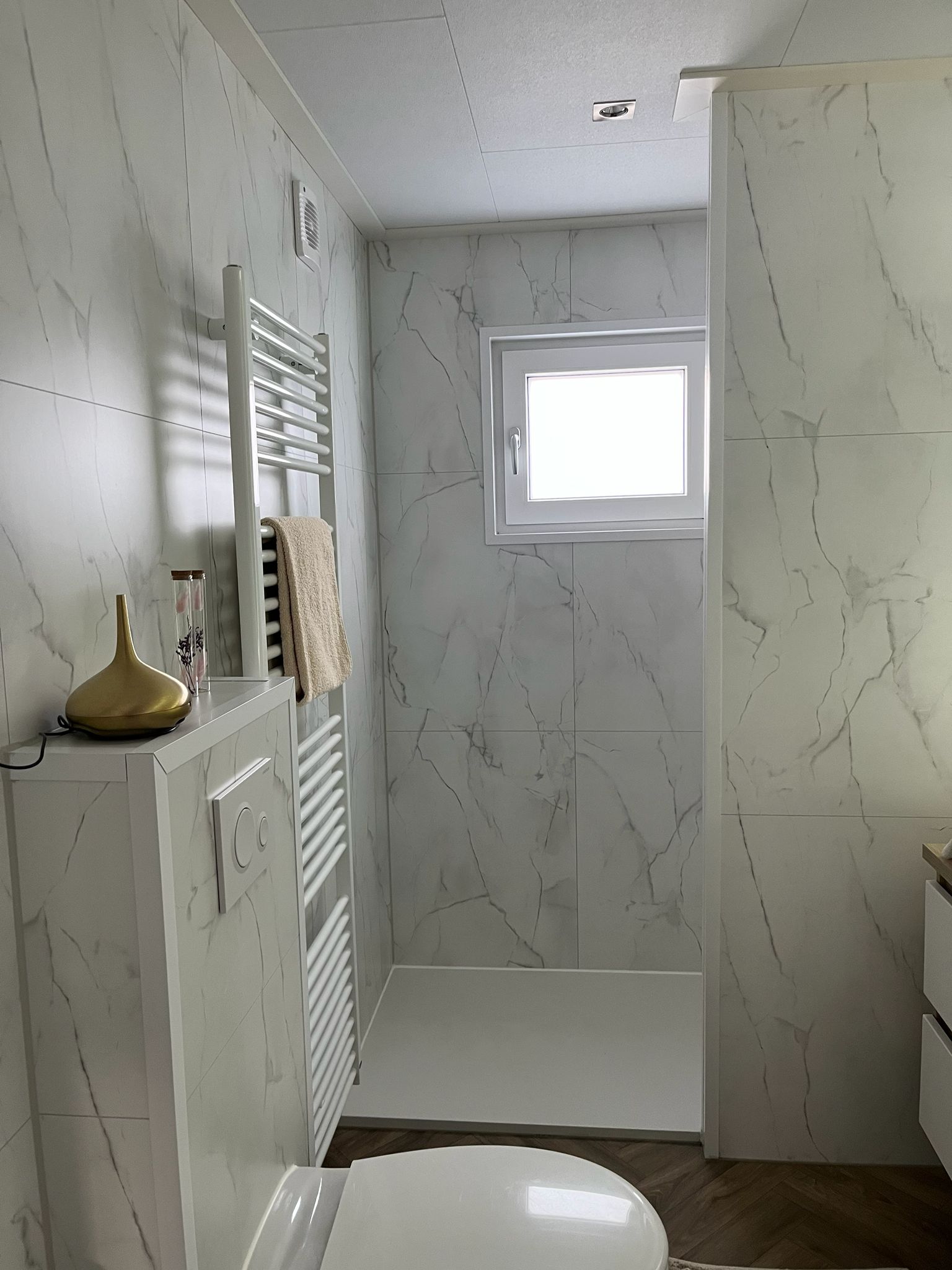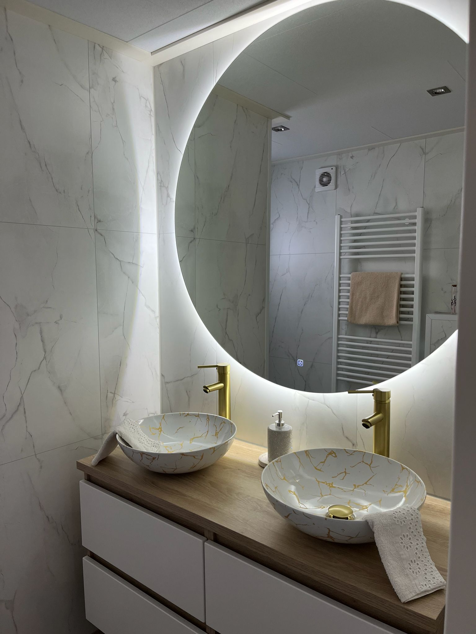 - mooie badkamer met dubbele wasbak en verwarmde lichtgevende spiegel! En inloop douche en wc !