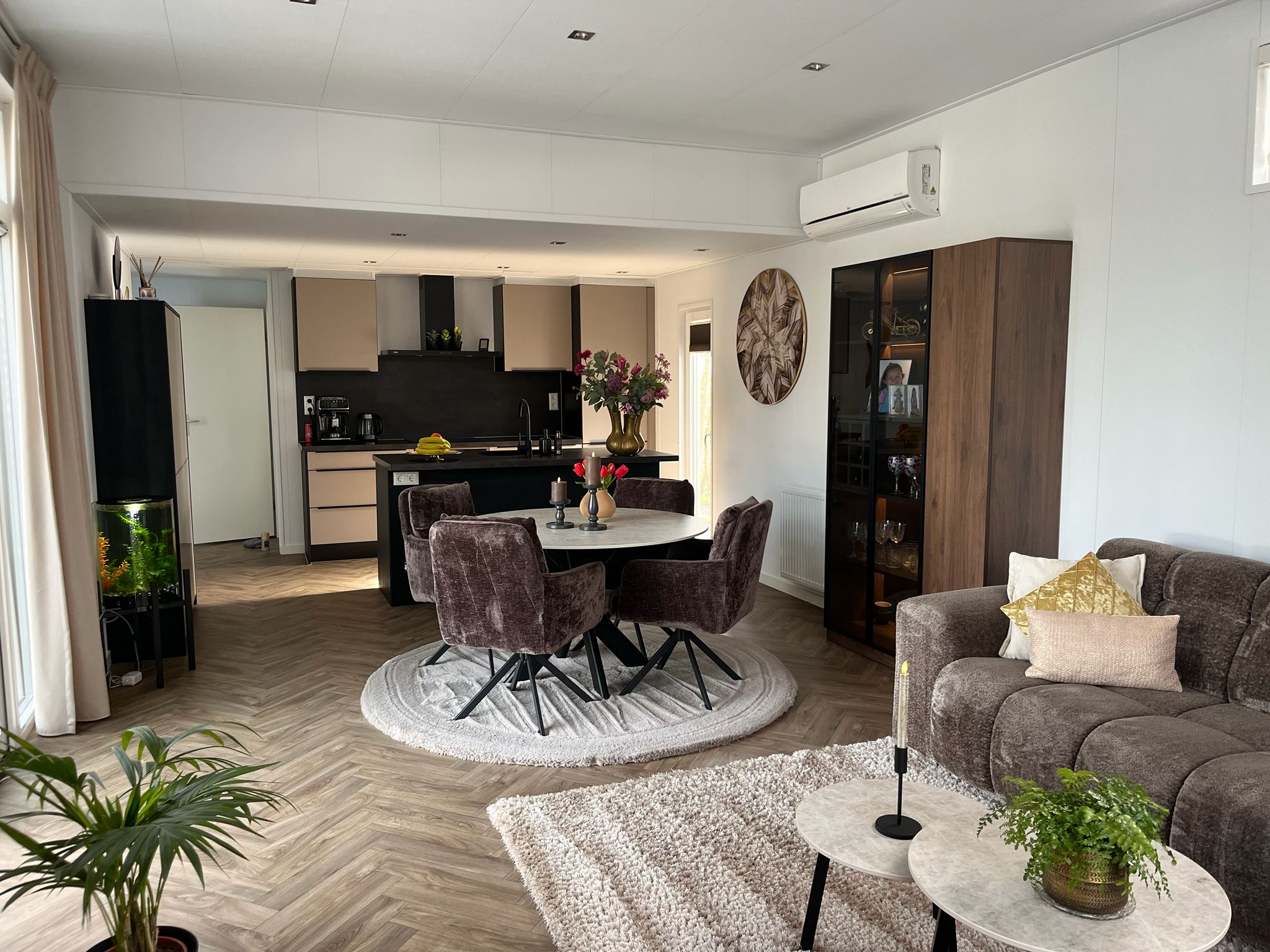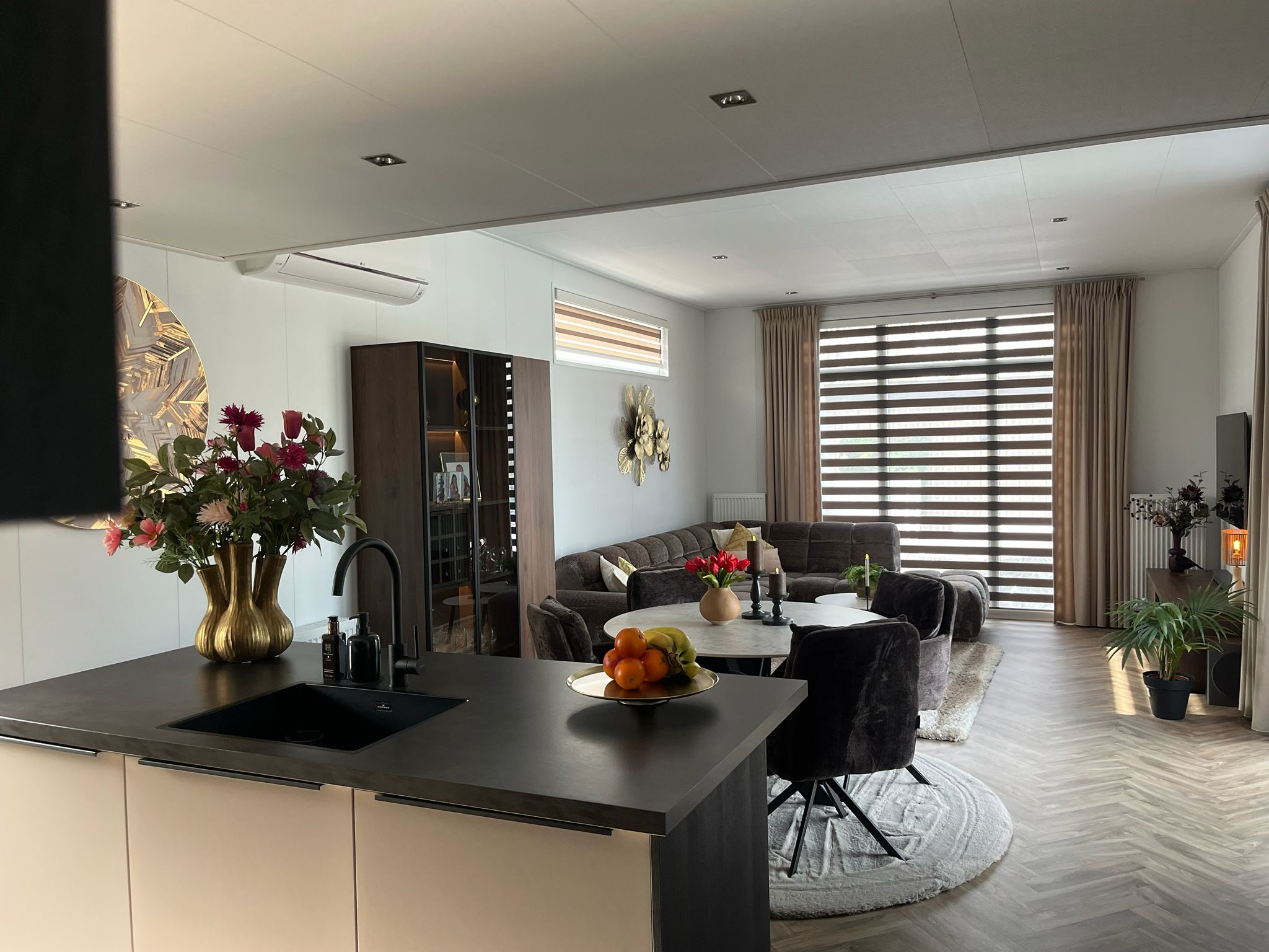 - cube veranda van 6 bij 4 ( 24m2) met zonnewering en duo gordijnen ( elektrisch en gordijnen op rail ( handmatig )