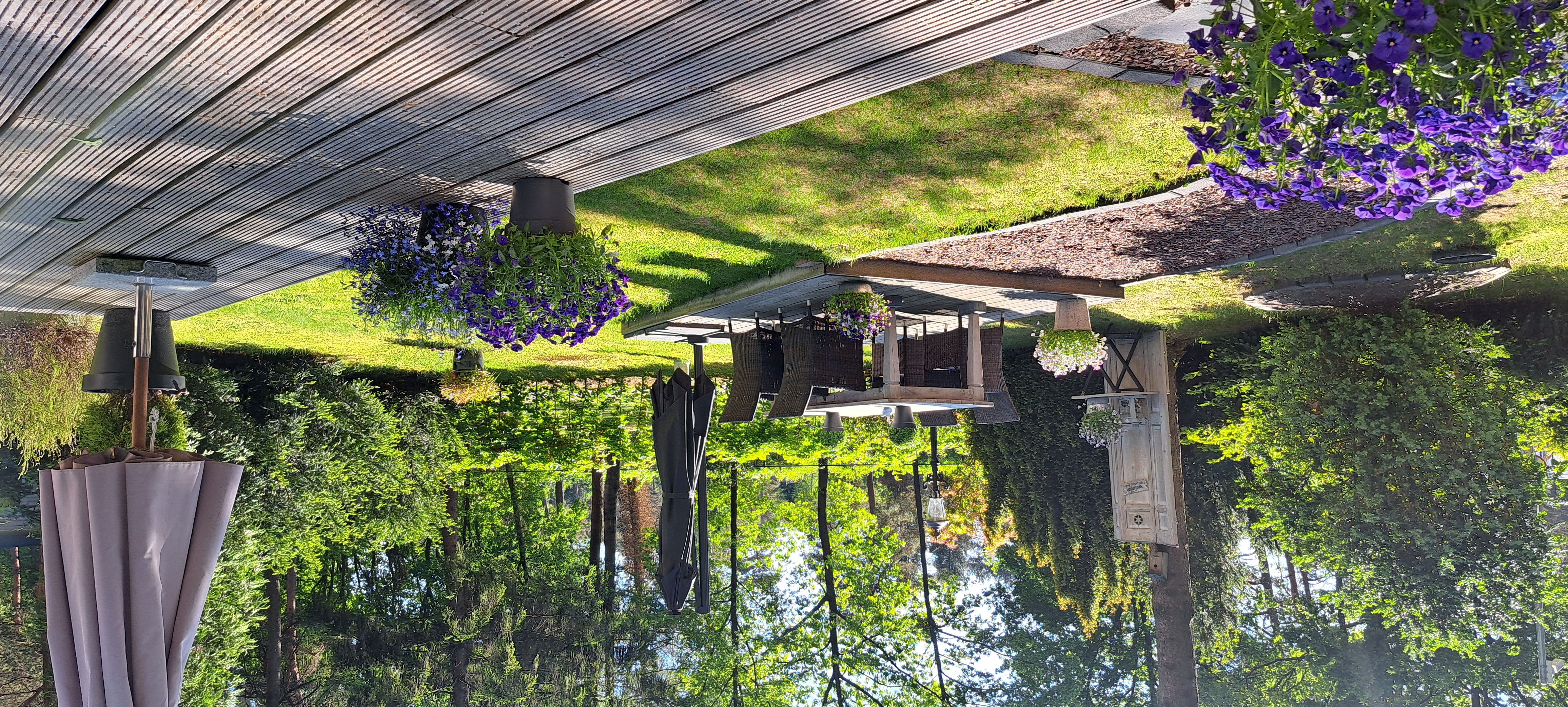 Voor het tuinhuis kun je heerlijk beschut in de zon zitten